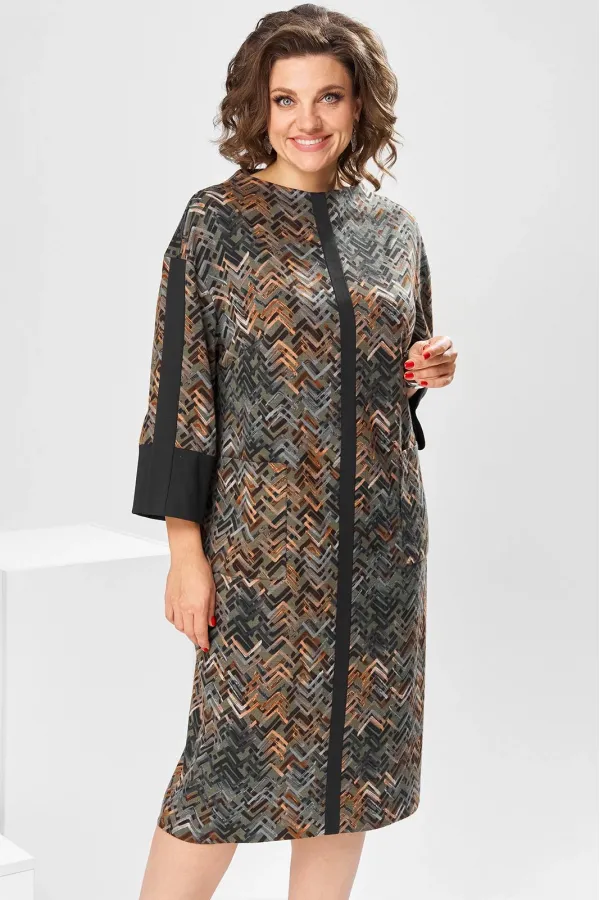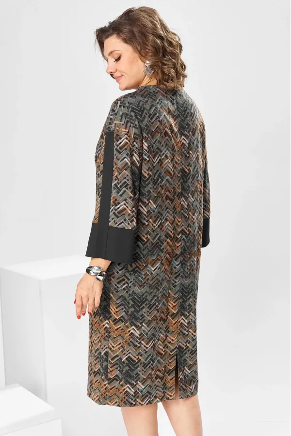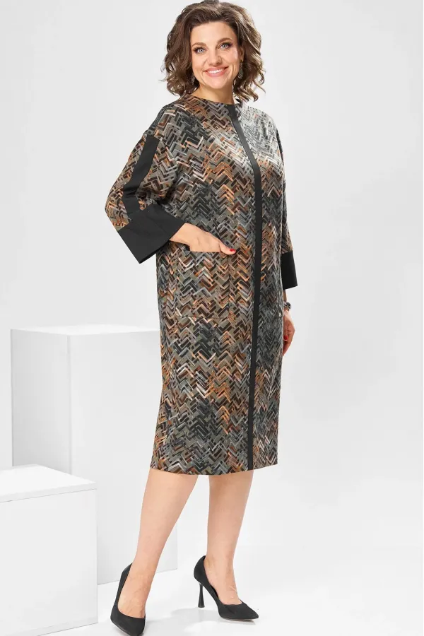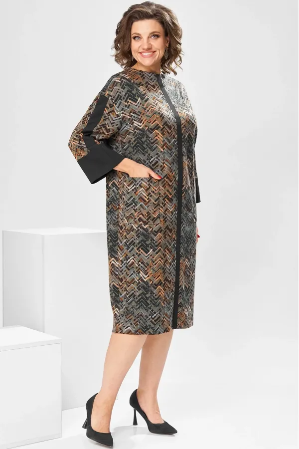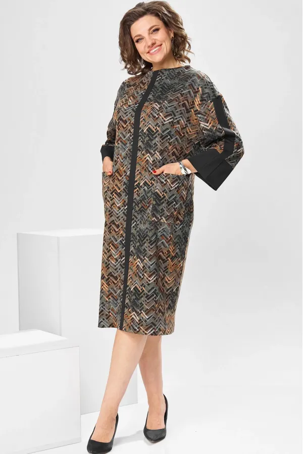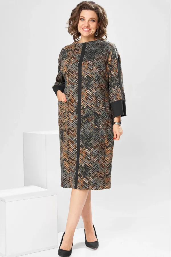 Платье женское для повседневной носки. Платье женское полу прилегающего силуэта, длиной за колено. Перед с 2-мянагрудными выточками, с 2-мя накладными прямоугольными карманами, на уровне линии бёдер, с приточной вертикальной планкой из отделочной ткани. Спинка со средним швом, заканчивающимся разрезом. Застёжка на потайную тесьму-молнию в среднем шве спинки. Горловина с цельнокроеной стойкой, обточная. Платье со спущенным плечом. Рукав втачной, длиной 7/8 с приточной манжетой из отделочной ткани и приточной вертикальной планкой из отделочной ткани по центру. Платье без плечевых накладок. Длина спинки 107 см, длина рукава от горловины 61 см.