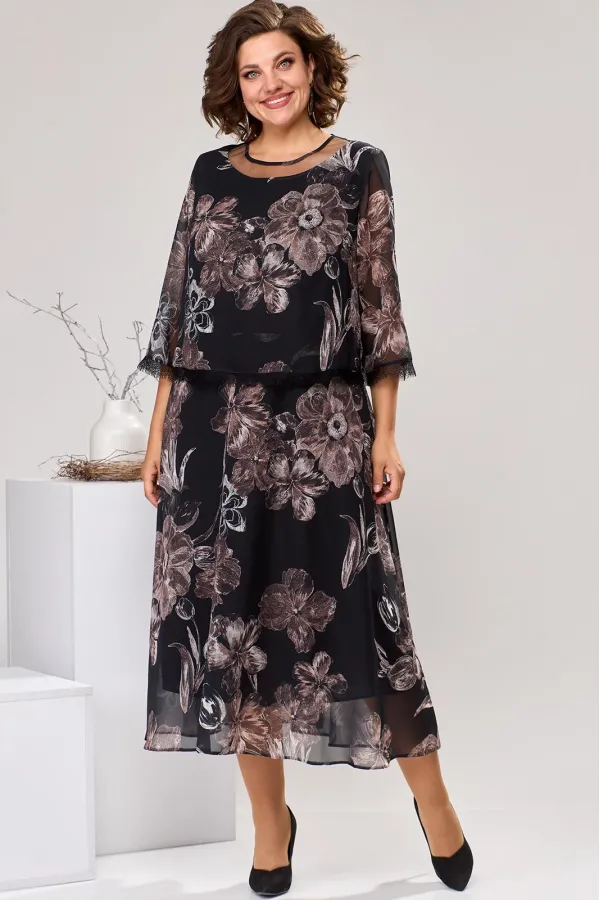 Платье женское, отрезное по линии талии, расширенное к низу, длиной до середины икры. Верхняя часть переда с 2-мя нагрудными выточками, отлётная, низ декорирован настрочным кружевом. Нижняя часть переда цельнокроеная. Верхняя часть спинки отлётная, низ декорирован надстрочным кружевом, нижняя - цельнокроеная. Горловина круглая, с втачной планкой из отделочной ткани по переду. Горловина с разрезом капелькой на спинке. Горловина и разрез обработаны косой бейкой, разрез фиксируется на 1-ну навесную петлю и 1-ну пришивную пуговицу. Рукав втачной, одно шовный, длиной 3/4 с притачным кружевом по низу. Платье на подкладке. Платье с плечевыми накладками.