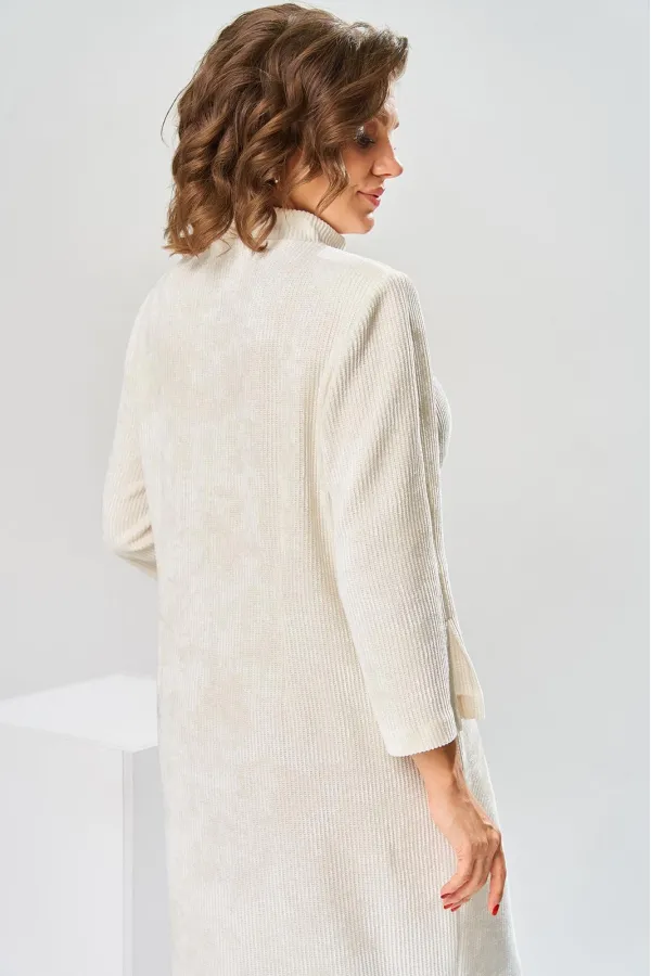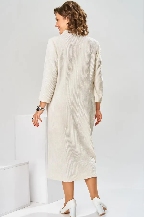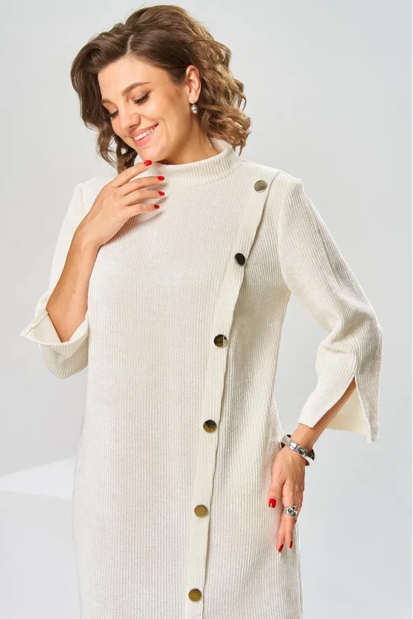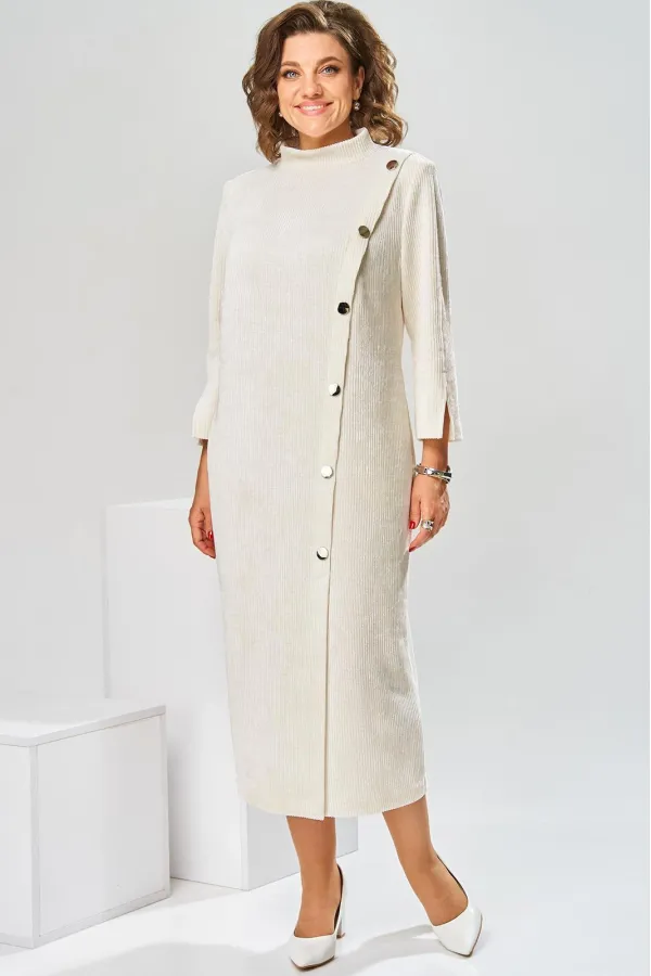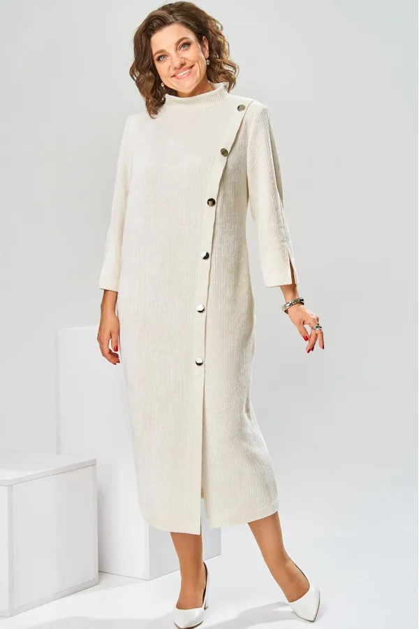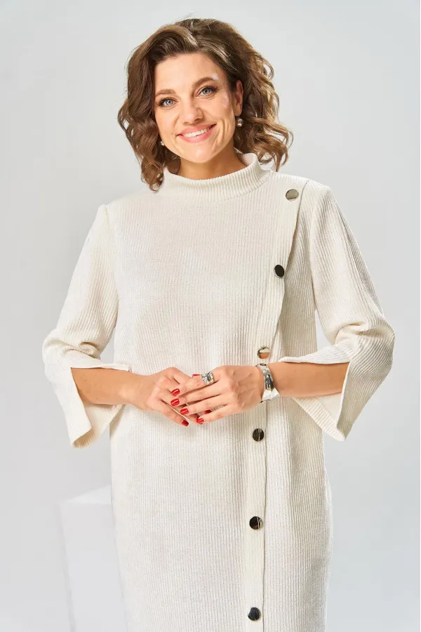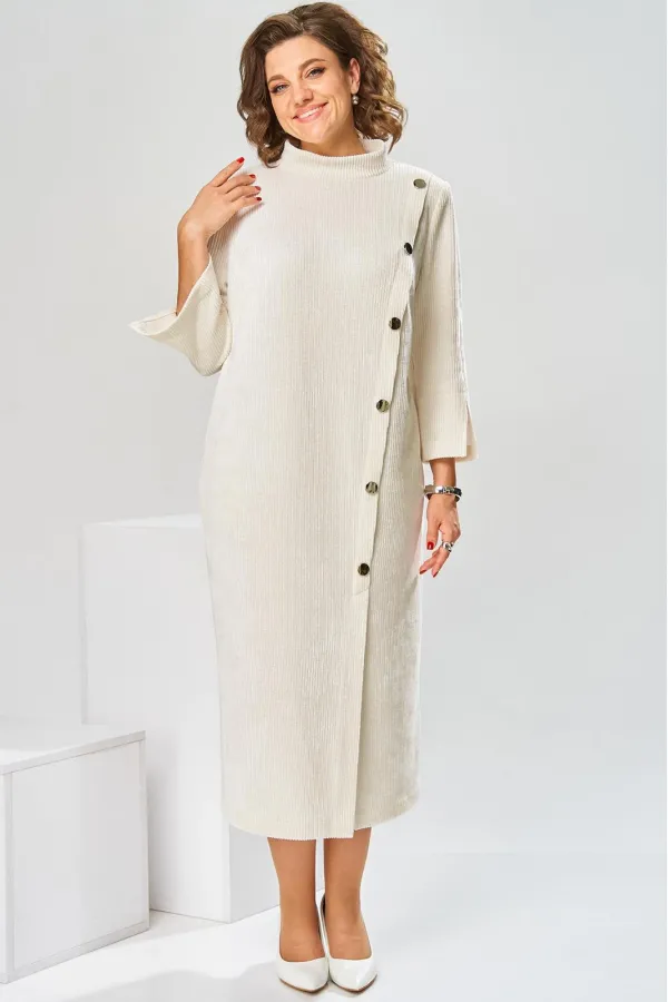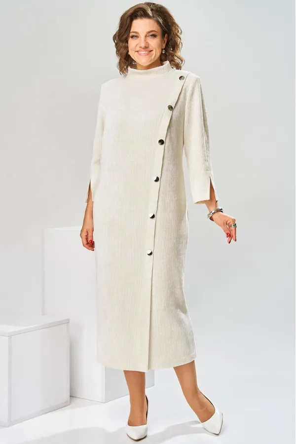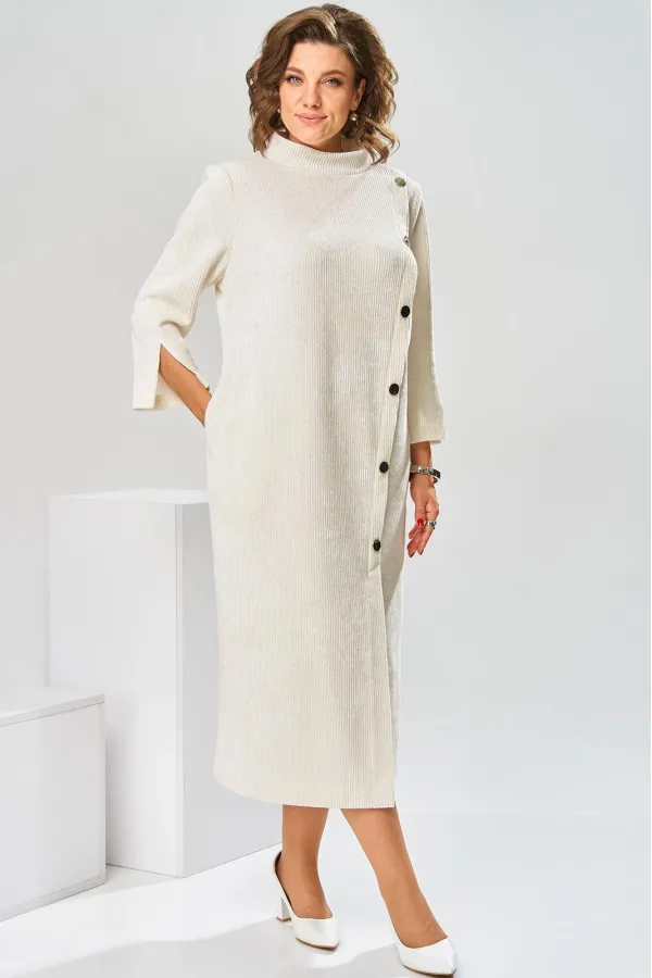 Платье женское предназначено для повседневной носки. Платье женское полу прилегающего силуэта, длиной до нижней части икры. Перед с 1-ной нагрудной вытачкой на центральной части, с 1-ним отрезным рельефом слева, выходящим из плечевого шва, шов соединения рельефа с передом декорирован 6-ю пришивными пуговицами и заканчивается шлицей. Спинка с 2-мя таллиевыми вытачками. В боковых швах обработаны карманы. Горловина круглая с втачной стойкой. Рукав втачной, 2-х шовный, длиной 7/8, верхний шов с разрезом. Платье с плечевыми накладками. Длина спинки платья 126 см, длина рукава 51 см.