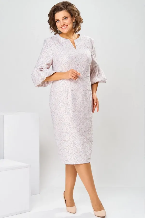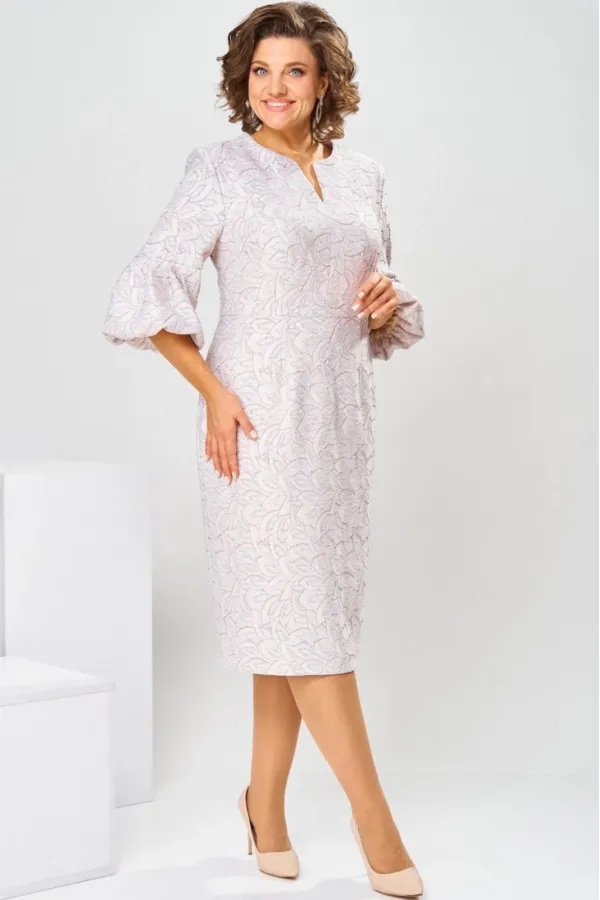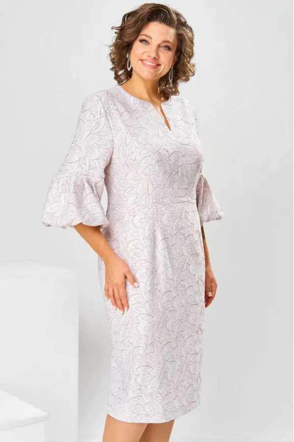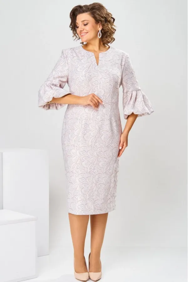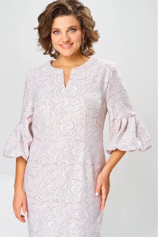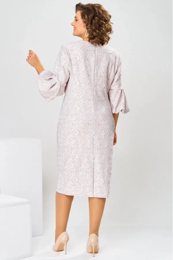 Платье женское, относится к торжественной нарядной одежде. Платье женское, полу прилегающего силуэта, длиной ниже колена. Перед отрезной по линии талии. Верхняя часть переда со средним швом и 2-мя таллиевыми вытачками, нижняя часть с 2-мя таллиевыми вытачками. Спинка с 2-мя таллиевыми вытачками и средним швом, заканчивающимся шлицей. Горловина фигурная, обточная, без воротника. Застёжка на потайную тесьму-молнию в среднем шве спинки. Рукав втачной, одно шовный, длиной 3/4, с горизонтальным разрезом, нижняя часть рукава с 5-ю односторонними складками, со сборкой по низу, низ обточной. Платье на подкладке с плечевыми накладками. Длина спинки платье 111 см, длина рукава 45 см.