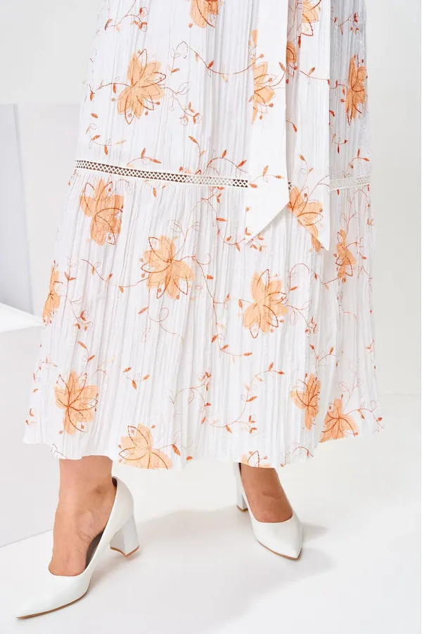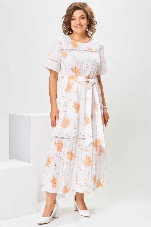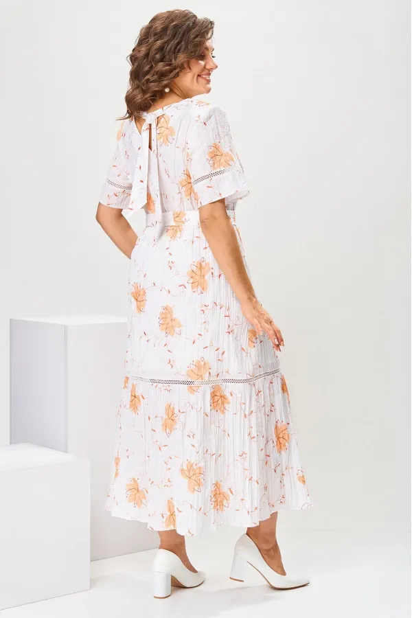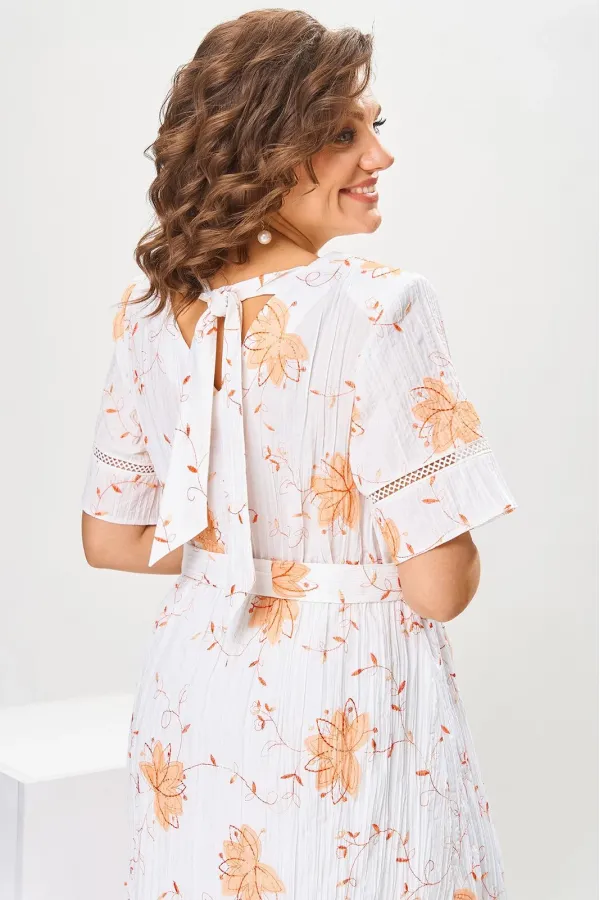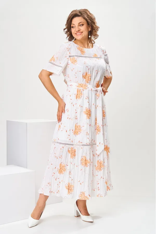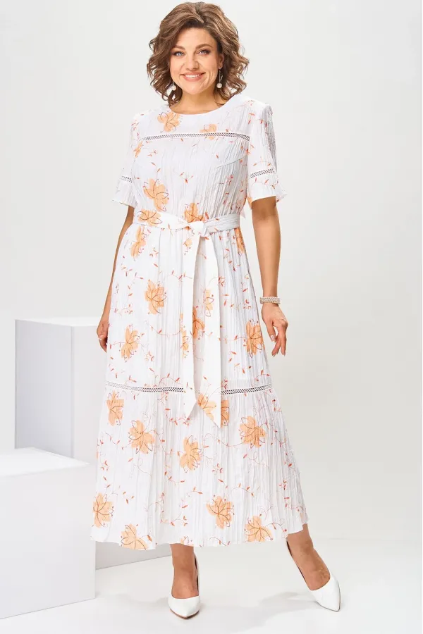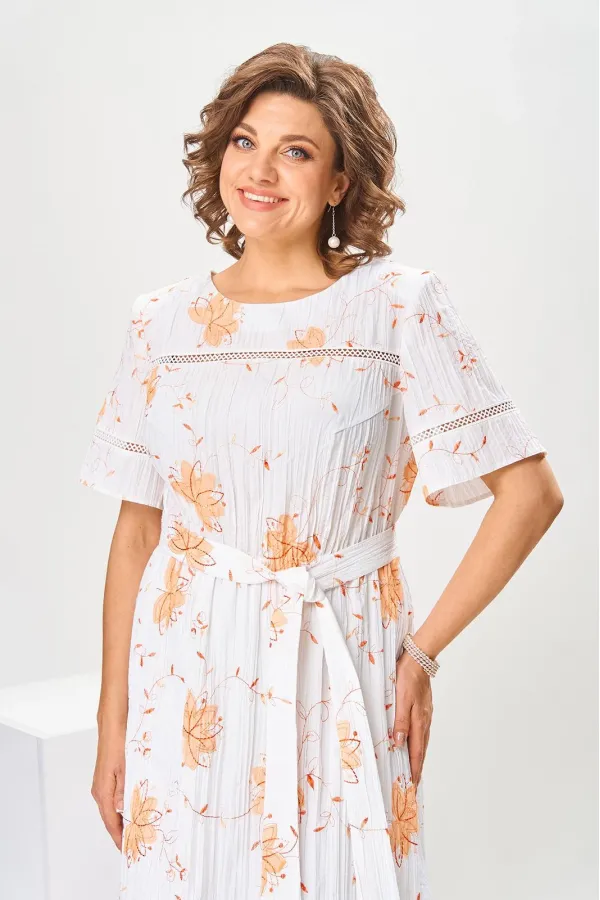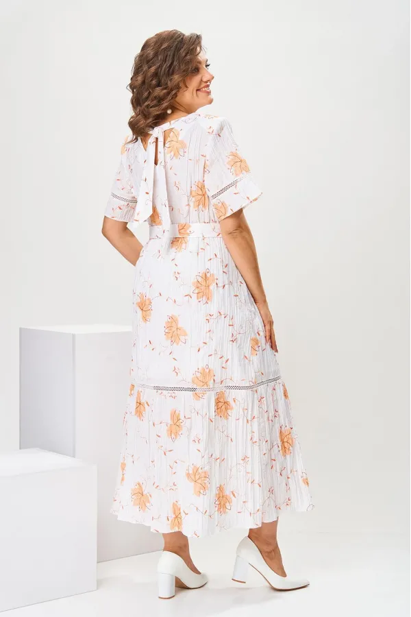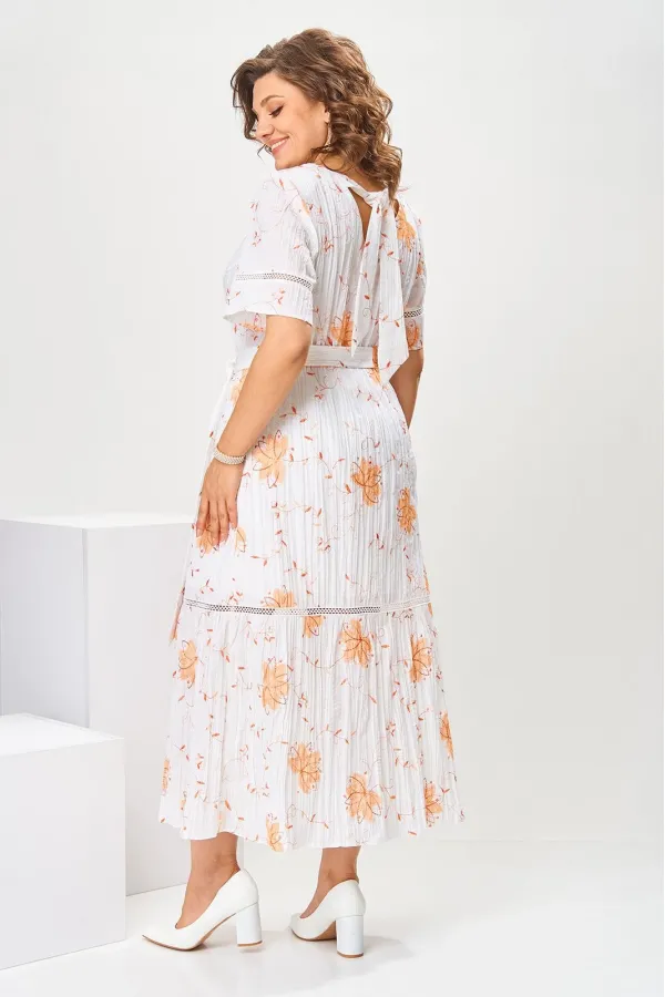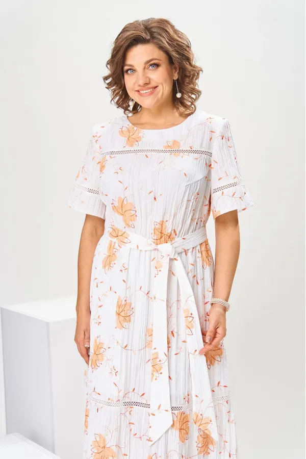 Платье женское, относится к нарядной торжественной одежде, но может использоваться и при повседневной носке. Платье женское, слегка расширенное к низу, длиной до нижней части икры. Перед с отрезной кокеткой, шов притачивания которой декорирован кружевом; с 2-мя нагрудными вытачками. Спинка цельнокроенная. Низ платья с притачным воланом, шов притачивания декорирован кружевом. Горловина круглая, обточная, без воротника, по спинке с v-образным вырезом, и 2-мя обтачными завязками. Рукав втачной, короткий одношовный с горизонтальным подрезом, декорированным кружевом. На уровне линии талии платье собрано на эластичную тесьму. Нижняя часть платья на подкладке. Платье с плечевыми накладками. К платью прилагается съёмный пояс. Длина спинки платья 115 см, длина рукава 27 см
