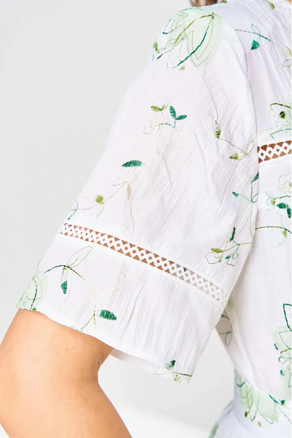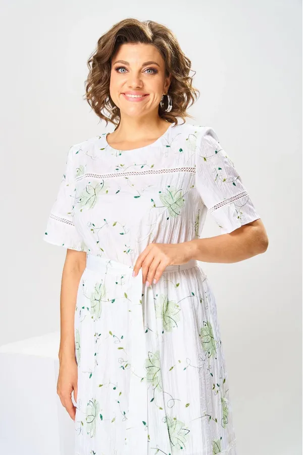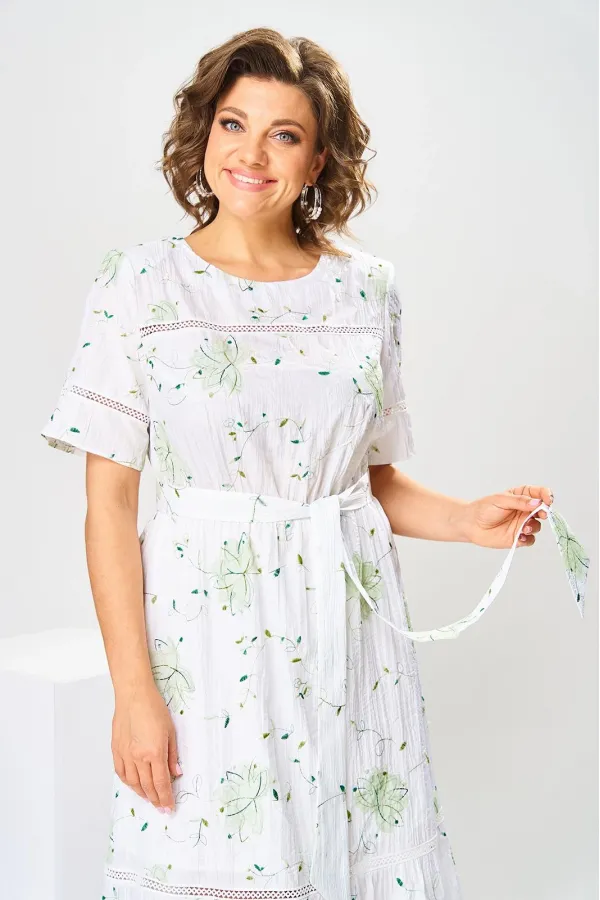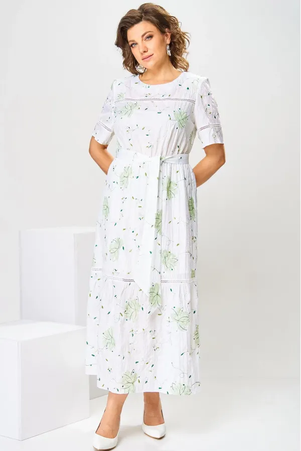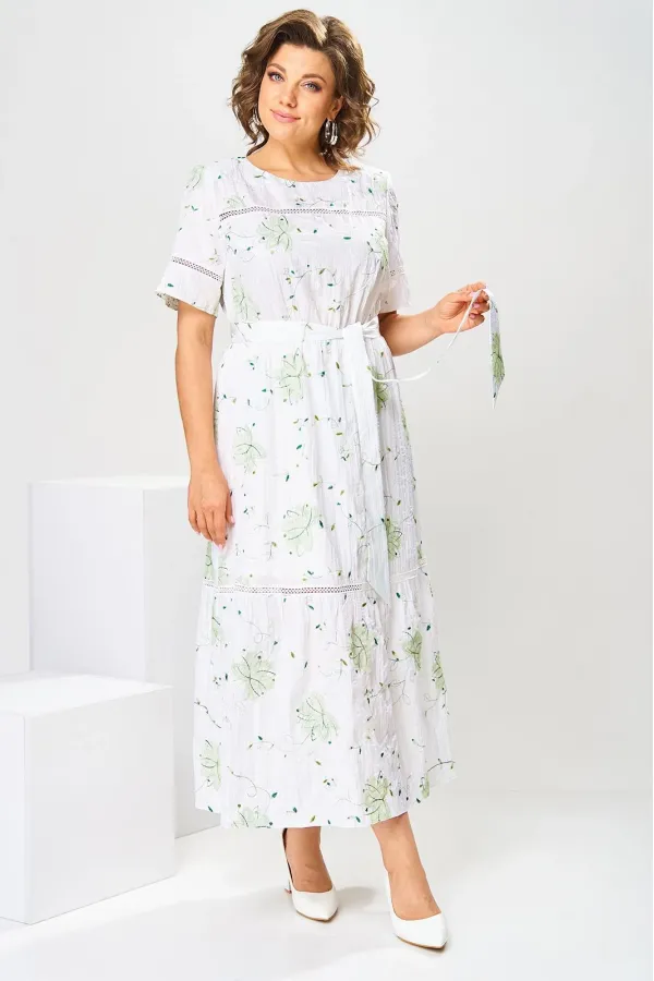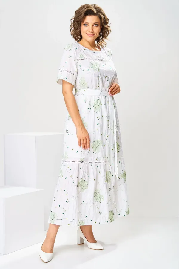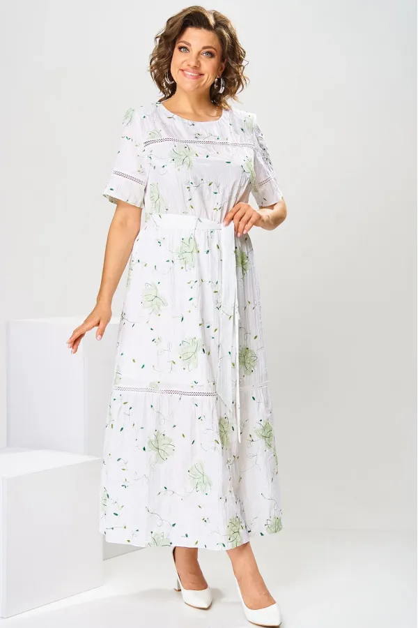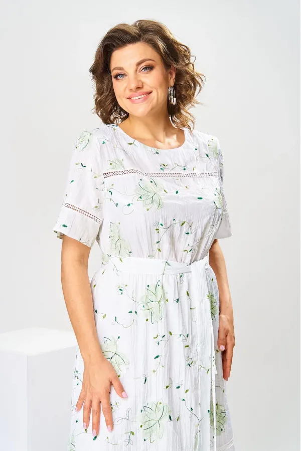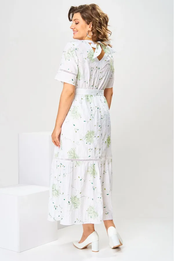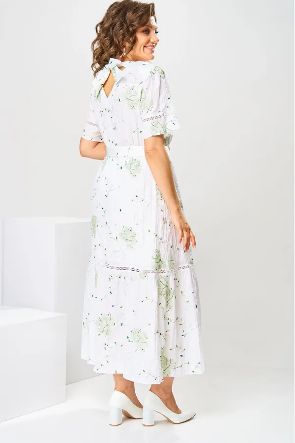 Платье женское, относится к нарядной торжественной одежде, но может использоваться и при повседневной носке. Платье женское, слегка расширенное к низу, длиной до нижней части икры. Перед с отрезной кокеткой, шов притачивания которой декорирован кружевом; с 2-мя нагрудными вытачками. Спинка цельнокроенная. Низ платья с притачным воланом, шов притачивания декорирован кружевом. Горловина круглая, обточная, без воротника, по спинке с v-образным вырезом, и 2-мя обтачными завязками. Рукав втачной, короткий одношовный с горизонтальным подрезом, декорированным кружевом. На уровне линии талии платье собрано на эластичную тесьму. Нижняя часть платья на подкладке. Платье с плечевыми накладками. К платью прилагается съёмный пояс. Длина спинки платья 115 см, длина рукава 27 см