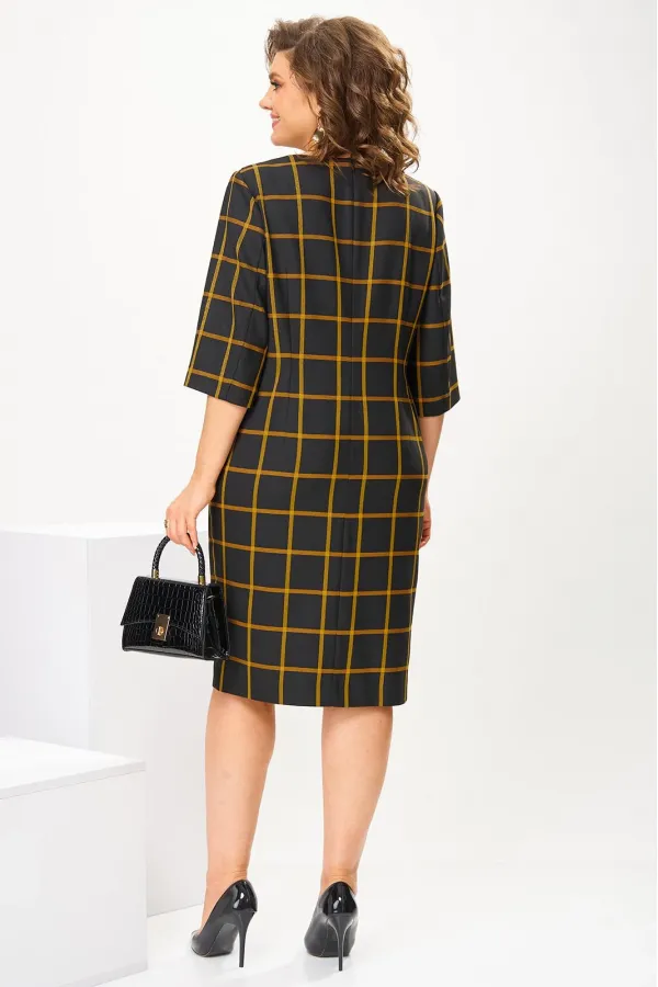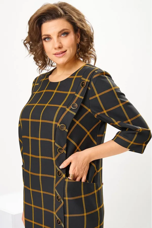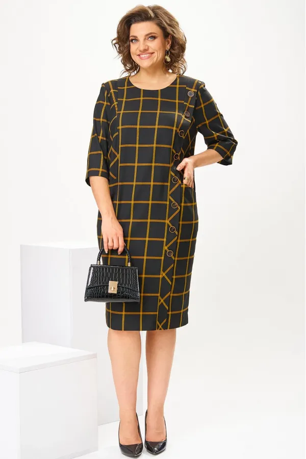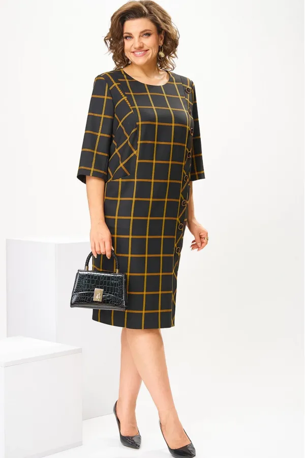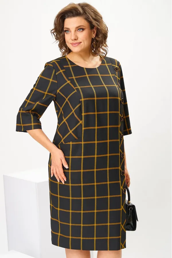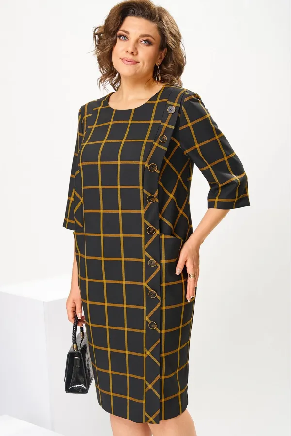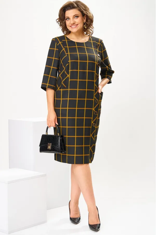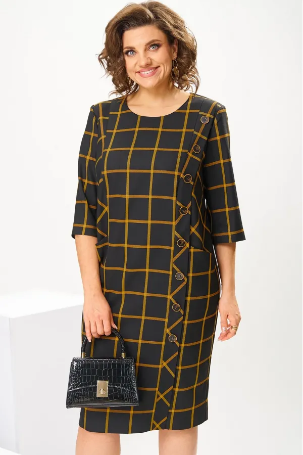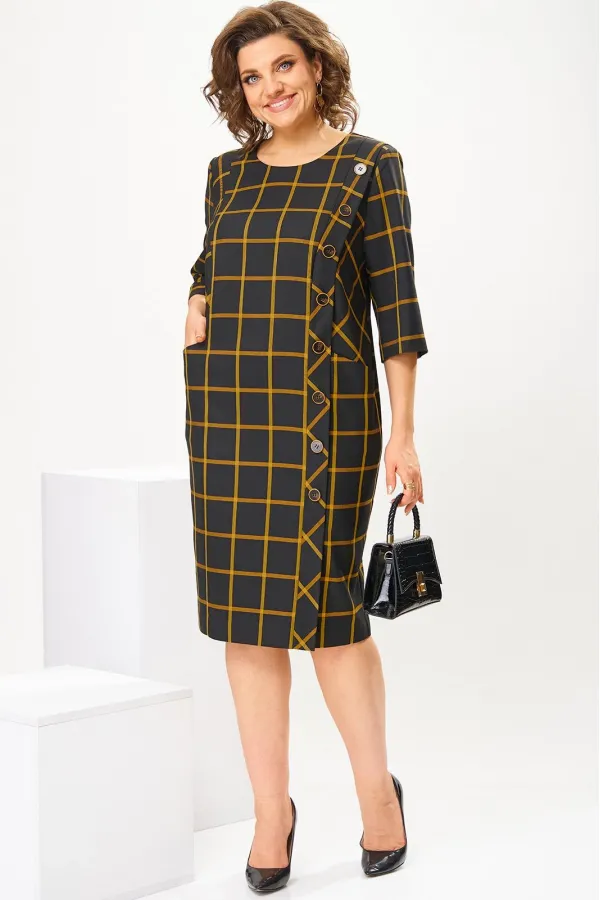 Платье женское, предназначено для повседневной носки. Платье женское, полу прилегающего силуэта, длиной за колено. Перед с 2-мя рельефами, выходящими из плечевых швов, с 2-мя карманами, обработанными на рельефах, с вертикальной планкой, декорированной 8-мью пришивными пуговицами на левом рельефе, шов соединения левого рельефа с передом заканчивается шлицей. Спинка с 2-мя таллиевыми вытачками и средним швом. Горловина круглая, обточная, без воротника. Застёжка на потайную тесьму молнию в среднем шве спинки. Рукав втачной, 2-х шовный, длиной 3/4. Платье с плечевыми накладками. Длина спинки 102 см, длина рукава 42 см.