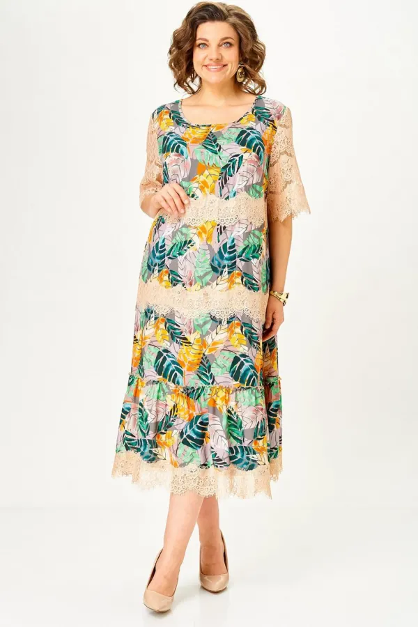 Платье женское А – силуэта с втачным рукавом. По линии груди переда вытачки. По низу платья широкая отделочная деталь со сборкой. Рукава платья выполнены из кружева. Низ платья и каждый ярус декорированы кружевом.