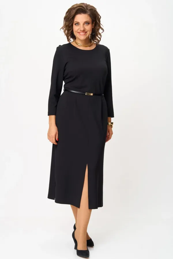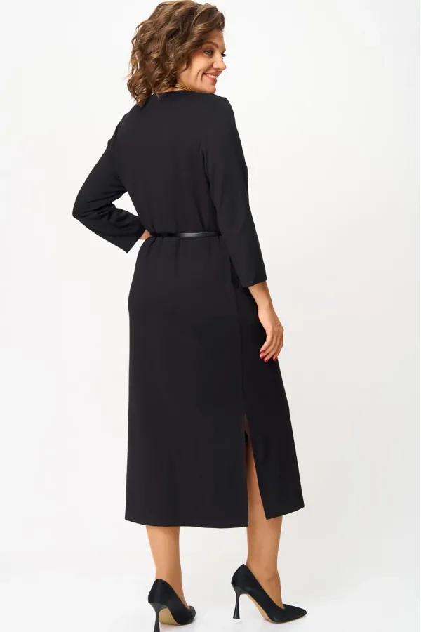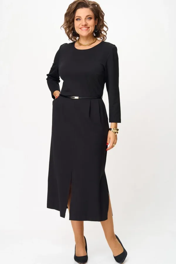 Платье женское полуприлегающего силуэта с втачным рукавом. Перед платья с горизонтальным эластичным швом по талии. Верхняя часть с вытачками по линии груди, нижняя часть со складками в области талии и карманами что обеспечивает прекрасную посадку и подчеркивает фигуру. Рукав длиной 7/8. Высокие разрезы по бокам и переду платья добавляют удобства. В комплекте съемный ремень.