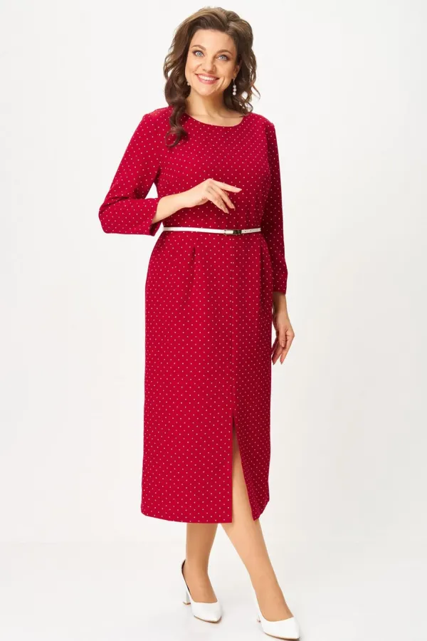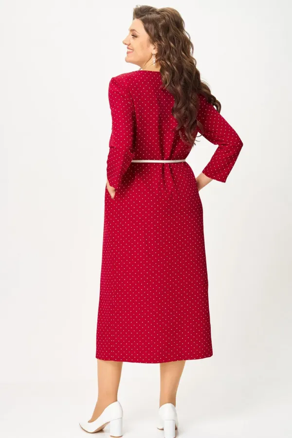 Платье женское полуприлегающего силуэта с втачным рукавом. Перед платья с горизонтальным швом по талии. Верхняя часть с вытачками по линии груди, нижняя часть со складками в области талии и карманами что обеспечивает прекрасную посадку и подчеркивает фигуру. Разрез по переду платья добавляет нотку игривости и удобства. В комплекте съемный ремень.