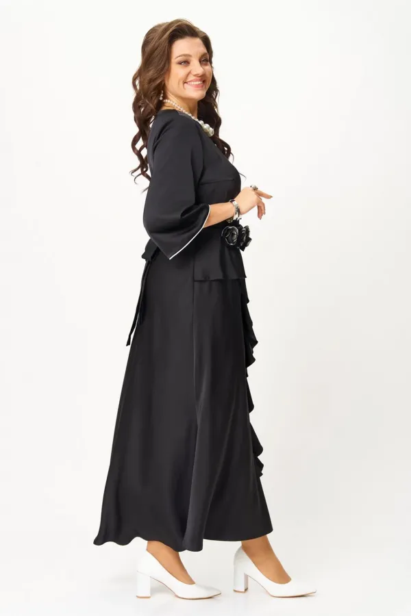 Платье женское вечернее полуприлегающего силуэта с втачным рукавом. Горловины округлой формы. По линии груди вытачки. Застежка на потайную молнию в левом боковом шве. Платье отрезное по линии талии, нижняя часть расклешенная. Нижняя часть переда оформлена воланом, переходящим в шов по переду, что добавляет романтичности и легкости. Нижняя часть спинки со средним швом.