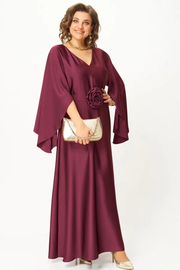 Платье женское вечернее полуприлегающего силуэта с расширением понизу. Вырез горловины v- образный. Застежка на потайную молнию в левом боковом шве. Платье отрезное по линии талии, нижняя часть переда и спинки расклешенная. Цельнокроеные рукава волнообразной формы добавляют романтичности и легкости. По линии талии съемный пояс с украшением ручной работы в виде цветка. Такое платье отлично подойдет как для вечернего выхода, так и для более формальных событий.