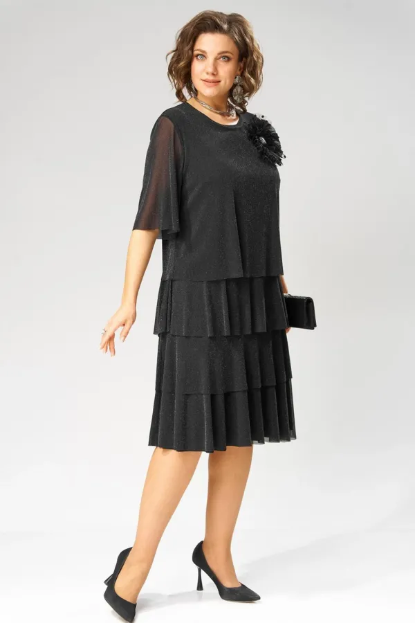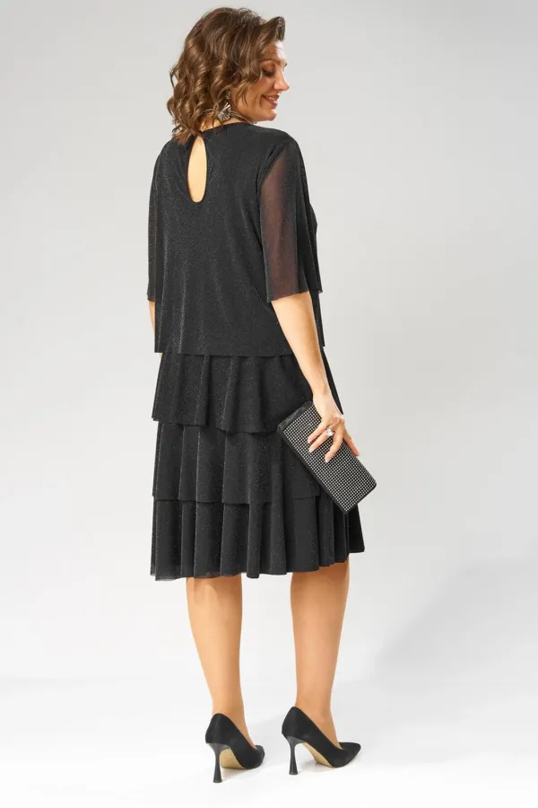 Платье женское свободного А-силуэта выполнено на подкладке из трикотажной ткани, с втачным рукавом. Горловина округлой формы. Верхняя часть платья отлетная, что придает изысканность платью. По переду расположены нагрудные вытачки, по спинке застежка на петлю и пуговицу в форме капельки, обеспечивающей идеальную посадку. Особенный акцент платья – это три ряда воланов по низу, добавляющие объем и изюминку. Нижний край воланов и рукавов не обработан.