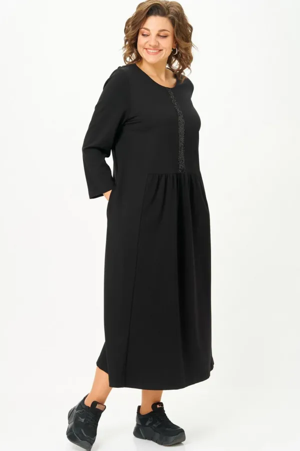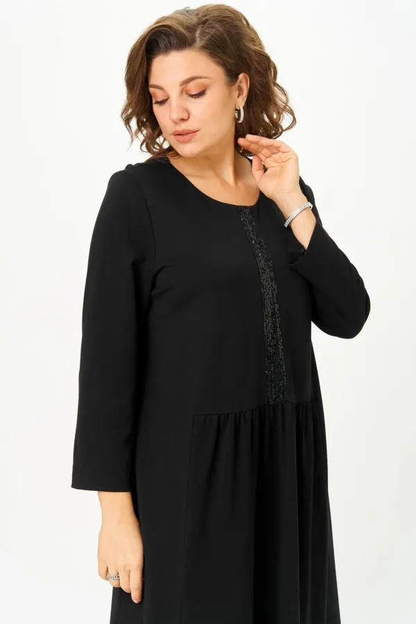 Платье женское свободного силуэта из трикотажного полотна. Модель длины - миди с изящной драпировкой по переду, с втачным рукавом длиной7/8. Горловина округлая. Верхняя часть переда украшена декоративной планкой с пайетк... Читать далее...
