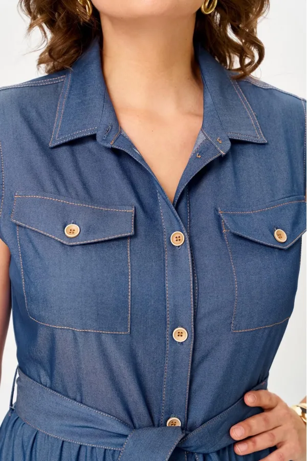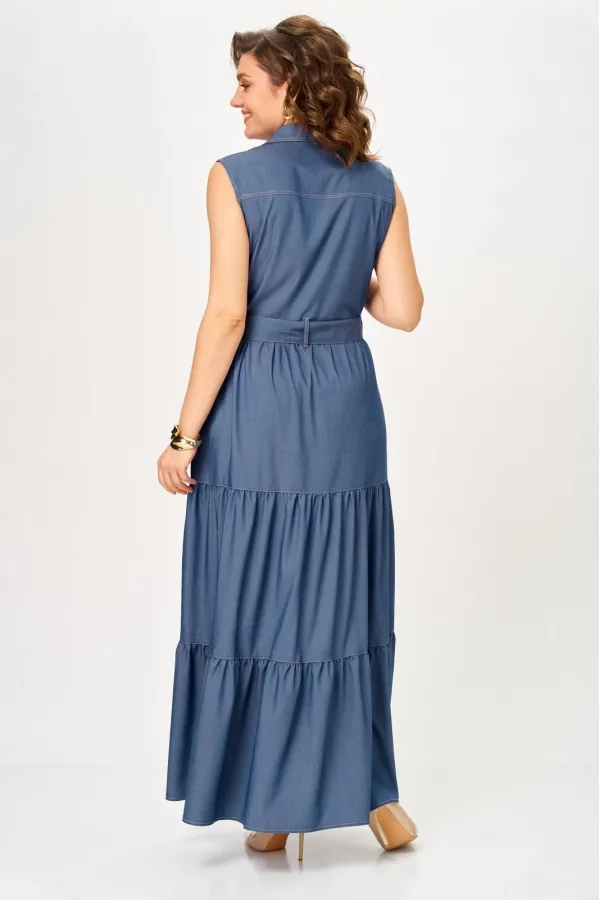 Платье женское с расширением по низу. Платье отрезное по линии талии. Верхняя часть с накладными карманами с клапаном. По линии груди вытачки. Спинка с кокеткой. Нижняя часть платья с двумя рядами оборки. Застежка центральная на петли и пуговицы. По горловине воротник на стойке. По линии груди вытачки. В комплекте пояс из основной ткани.