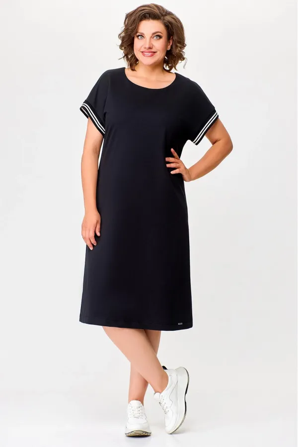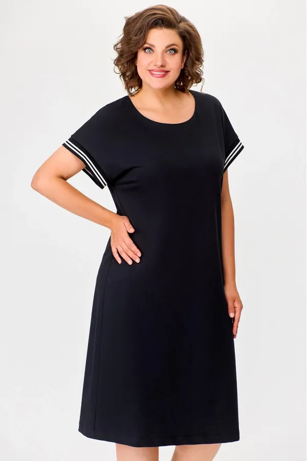 Платье из эластичного трикотажного полотна полуприлегающего силуэта. Перед цельнокроеный. Спинка со средним швом и разрезом с застёжкой на навесную петлю и потайную пуговицу по горловине. Рукав цельнокроеный короткий с манжетой из декоративного трикотажного довяза. В боковых швах обработаны карманы.По низу платя пришита фирменная эмблема «S W А L L O W».