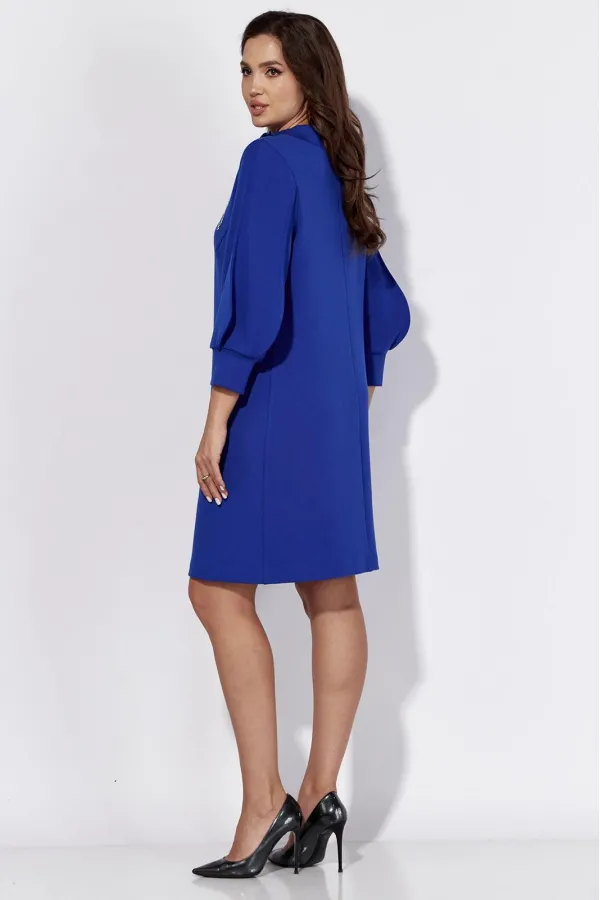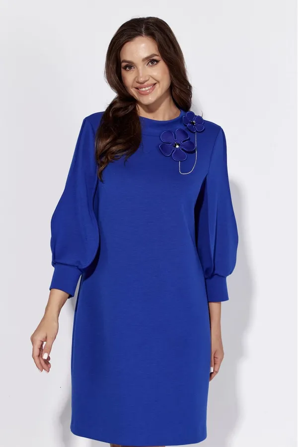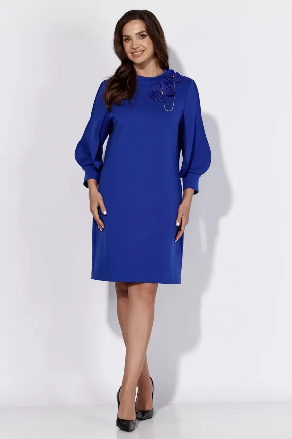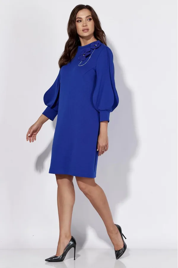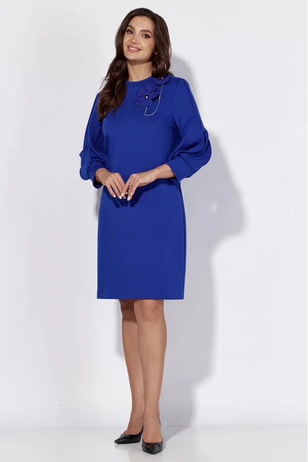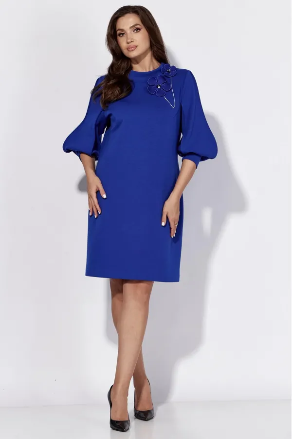 Платье женское, А-силуэта с втачным рукавом, длинной 3/4. Рукав фантазийной формы, типа фонарик состоящий из четырех деталей. Швы рукава отстрочены стройкой на ребро По переду нагрудные вытачки из пройм. Горловина оформлена расширенной , мягкой строчкой. Декором служит съемное украшение.