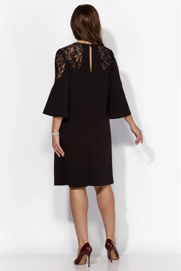 Платье женское А-образного силуэта с втачным рукавом длинной 3/4. Рукав расширенный к низу , с фигурной вставкой из отделочной ткани. По переду нагрудные вытачки и кокетка. Вырез горловины круглоф формы с ассиметричным пришивным декором. По спинке средний шов, кокетка сложной формы с разрезом. Застежка сзади на навесную петлю и отделочную пуговицу. Вставкирукавов и кокетки выполнены из отделочной ткани(прозрачная органза с рисунком.)