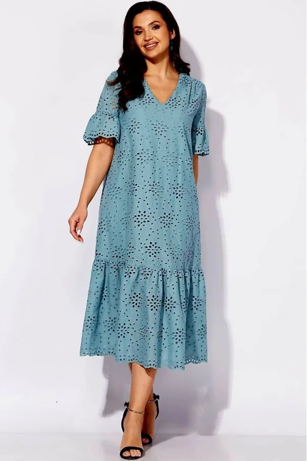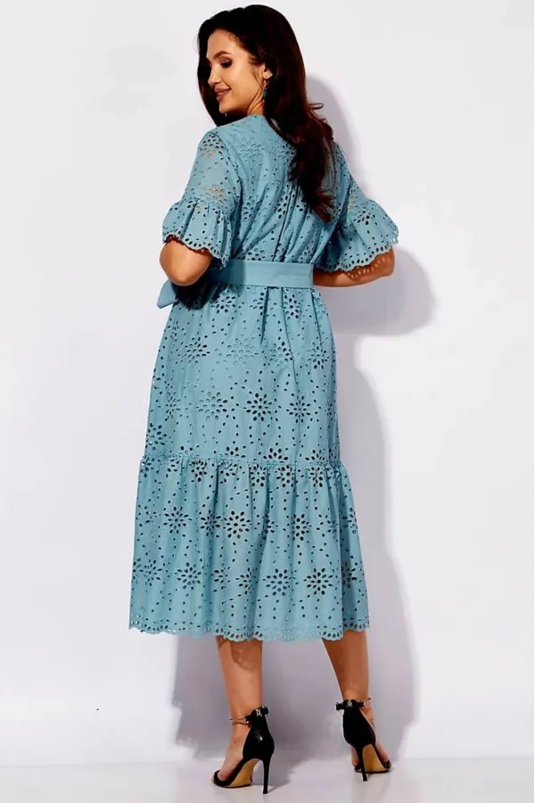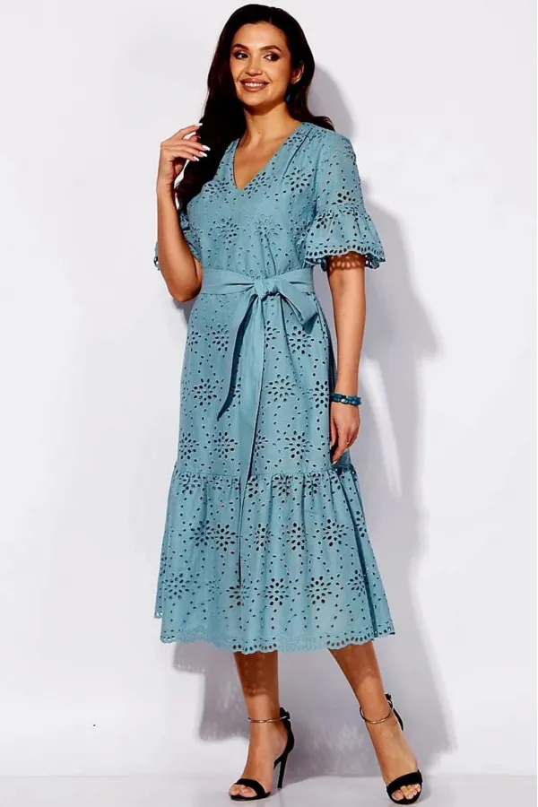 Платье женское, расширенное к низу, А образного силуэта, втачного покроя. Платье выполненоиз кружевного полотна на подкладке. Рукава до локтя с воланои по шву притачивания, по низу с каймой. По переду V образная горловина, кокетка переходящая на спинку, в швах в швах притачивания которой расположена сборка. По спинке кокетка. Низ платья оформлен воланом со сборкой и фигурной каймой. К платью прилагается пояс.
