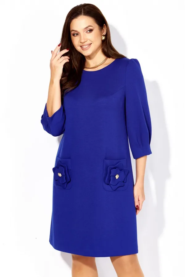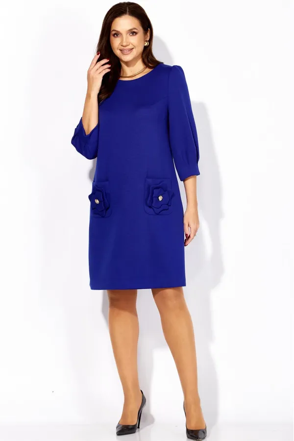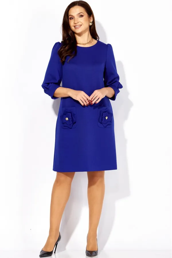 Платье женское, А силуэта, с рукавом длинной 3/4. Рукав втачной, со сборкой по окату, и мягкими складками по низу. По переду нагрудные вытачки. Вырез горловины круглой формы. Карманы накладные, акцентированы стилизированным цветком с декором. По спинке средний шов с отделочной нашивкой сверху.