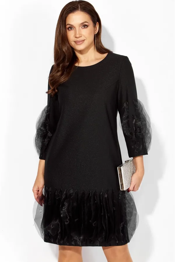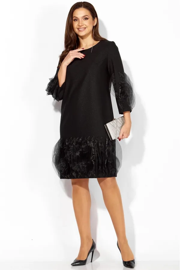 Платье женское, прямого силуэта, выполнено из ткани поливискоза S H A N E со стрейчем. По переду нагрудные вытачки из пройм. Рукав втачной, длинной 3/4. Низ платья по переду и нижняя часть рукава задекорированы фантазийными элементами ткани из органзы. Вырез горловины круглой формы. По спинке шов и застежка на потайную тесьму молния