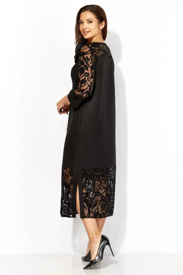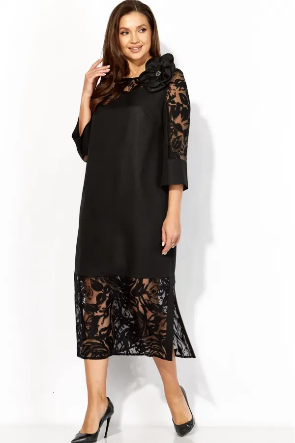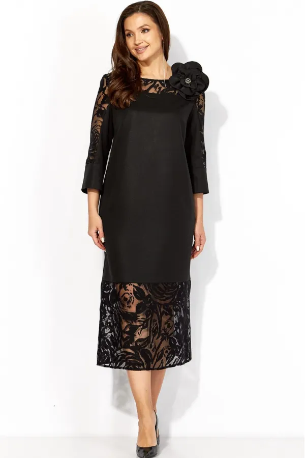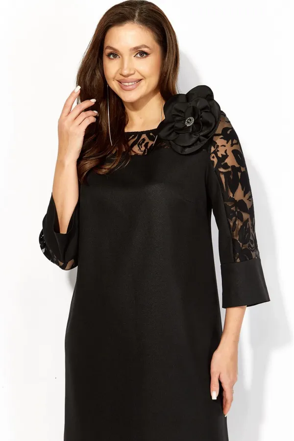 Платье женское, прямого силуэта, с втачным рукавом, длинной 3/4. Платье изготовлено из текстильной ткани с напылением и органзы с рисунком. Кокетки по переду и спинке, верхняя часть рукава и нижняя часть платья из огранзы. По боку разрез с отделочными планками. По низу рукава широкая манжета. Вырез горловины круглой формы. Застежка сзади на навесную петлю и пуговицу. Декором служит большой, съемный цветок из атласной ткани.