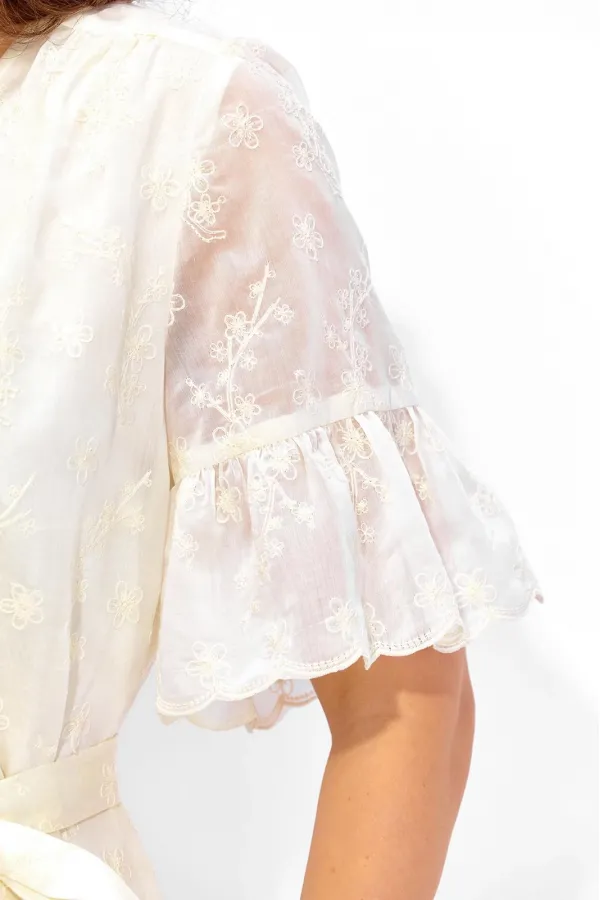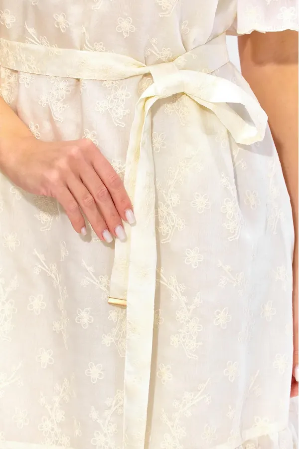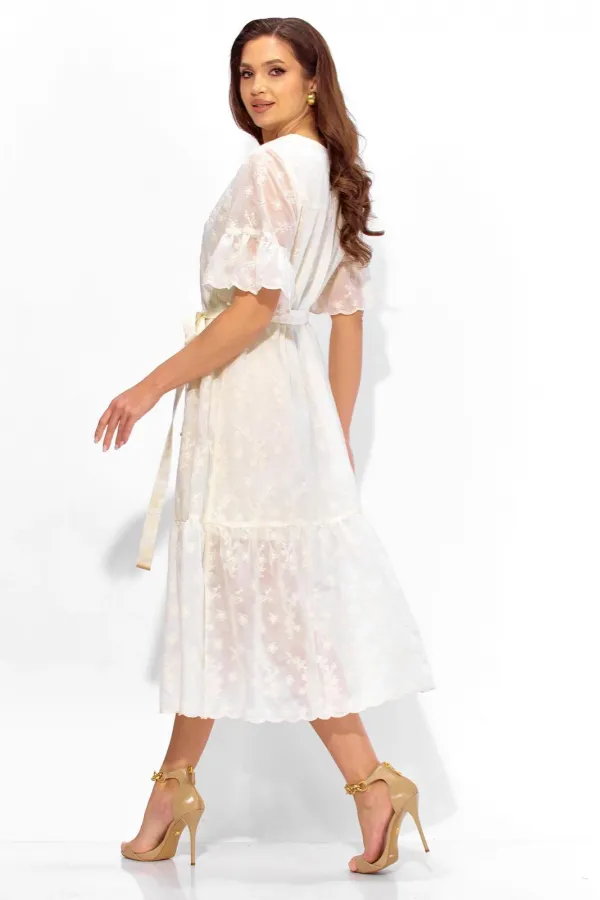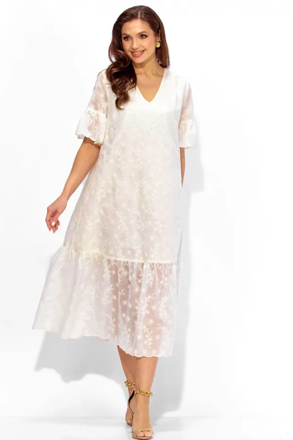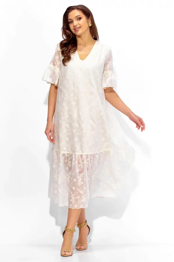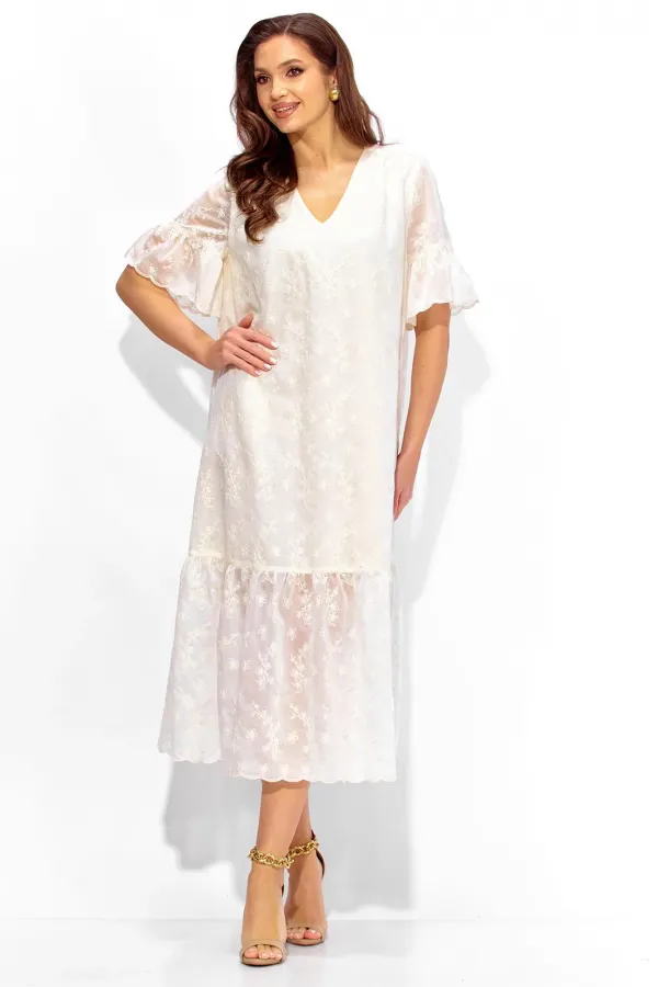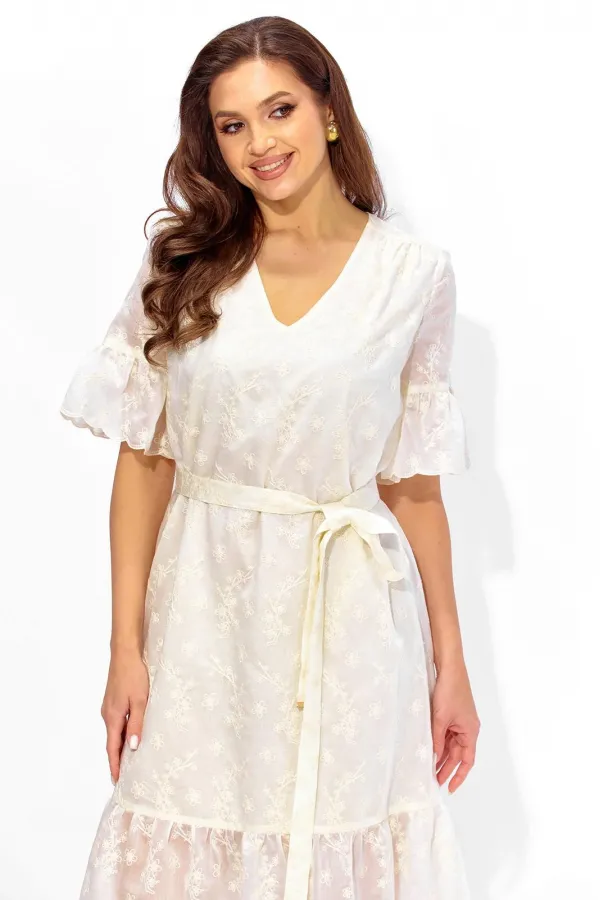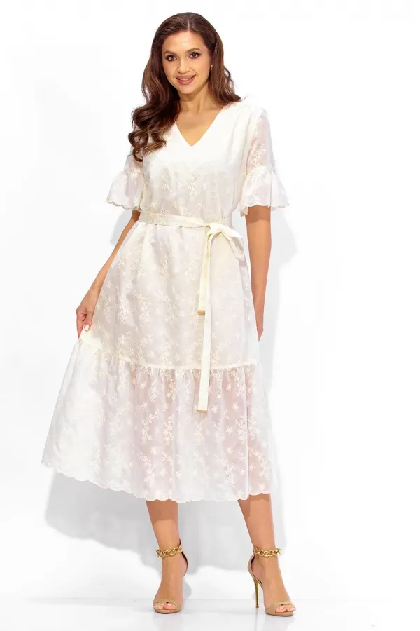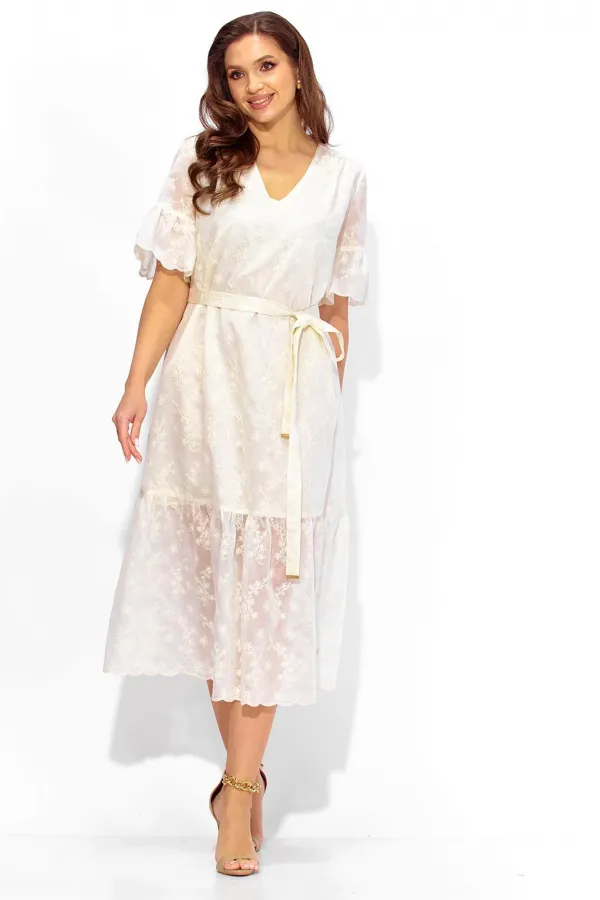 Платье женское, А-образного силуэта, расширенное к низу, с присобранным воланом по низу. Выполнено из кружевной ткани, на хлопковой подкладке. Рукав втачной, длинной до локтя с присобранным воланом по низу. Вырез горловины У-образной формы. По переду кокетка, переходящая на спинку. Сборка из под кокеток по переду, по спинке по центру кокетки. Дополнением служит съемный, мягкий пояс, с металическими зажмами на концах.