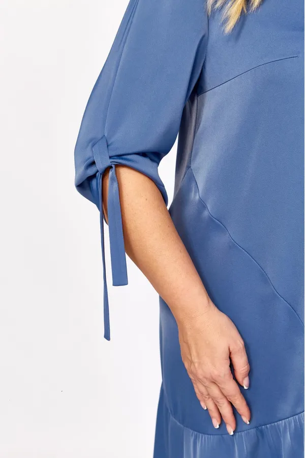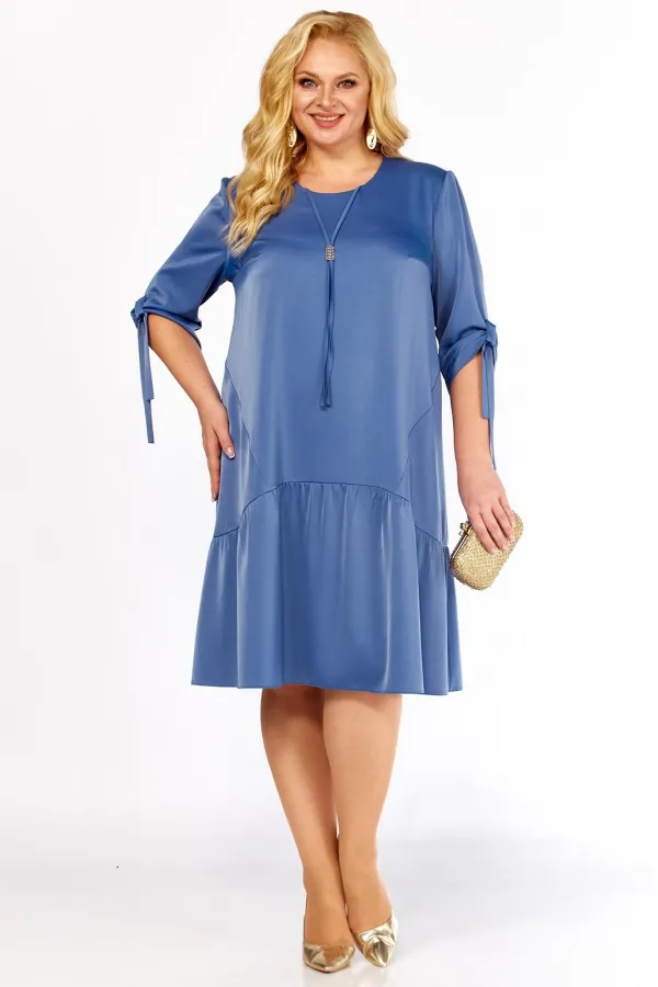 Нарядное платье лаконичного свободного силуэта элегантно подчеркнёт вашу красоту и придаст образу утончённость. Модель выполнена из стрейчевой струящейся ткани с матовым блеском. Перед с нагрудными вытачками, декоративными клиньями(переходящими на спинку), по низу с воздушным воланом со сборкой. Спинка со средним швом и воланом. Округлый вырез горловины дополнен декоративным элементом из основной ткани, плавно спадающим вдоль переда. Рукав втачной с вертикальным швом, длиной ниже локтя, по низу с завязывающейся патой. Отделкой комплекта служит фурнитура (может отличаться от представленной на фото).
