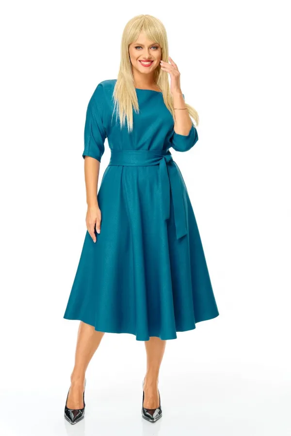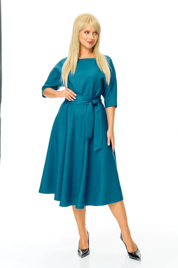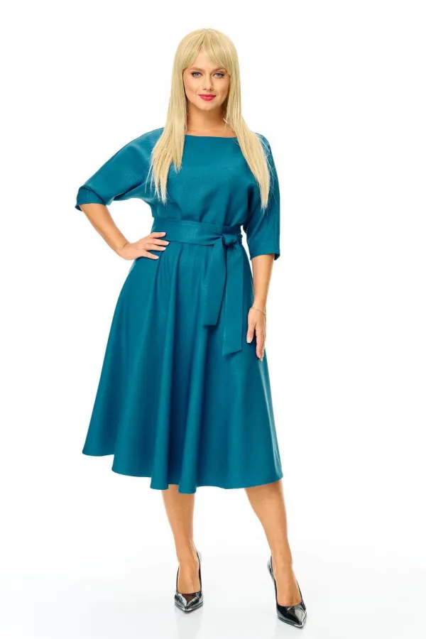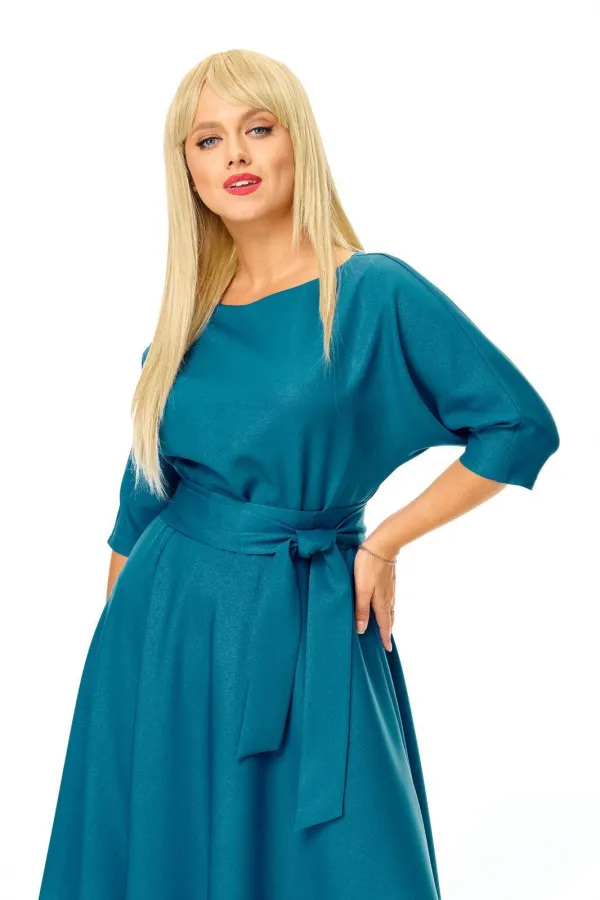 Лиф «летучая мышь» с цельнокроеным рукавом, зауженным к низу. Летящая юбка «полусолнце», по талии эластичная тесьма. Без застежки. Горловина овальная. Пояс длинный, завязывается на талии в два оборота.