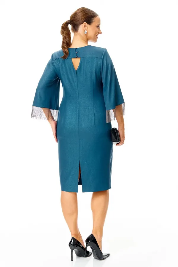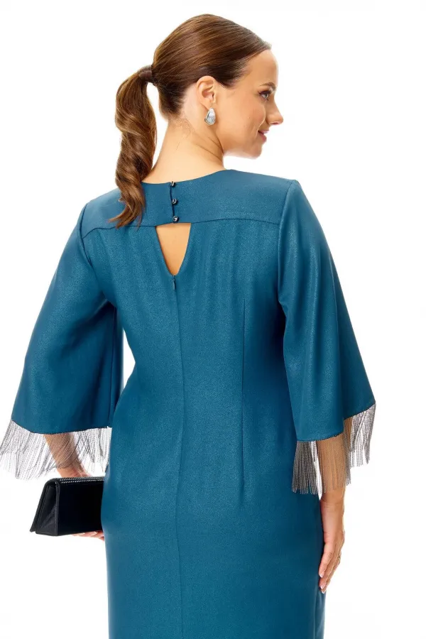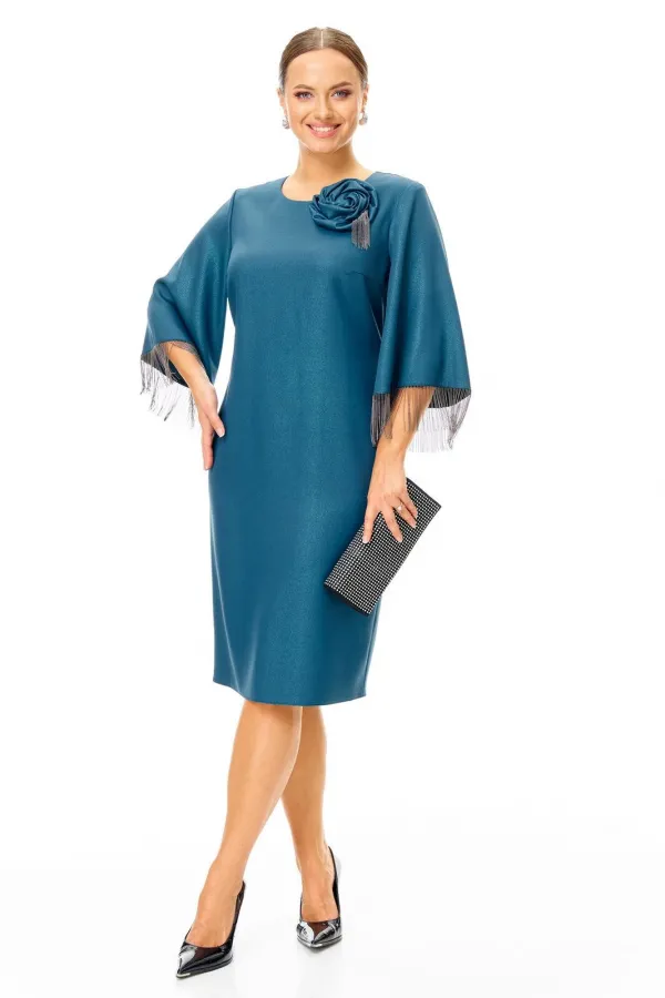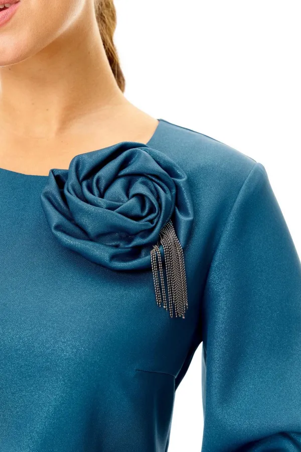 Нарядное женственное платье из ткани с блестящим напылением и декоративным съемным цветком. Платье полуприлегающего силуэта. Горловина круглая. Рукав расширенный длина 3/4 с необычной бахромой из цепочки по низу. По спинке застежка «молния» и завлекательный «уголок» с пуговичками. Платье без подкладки.