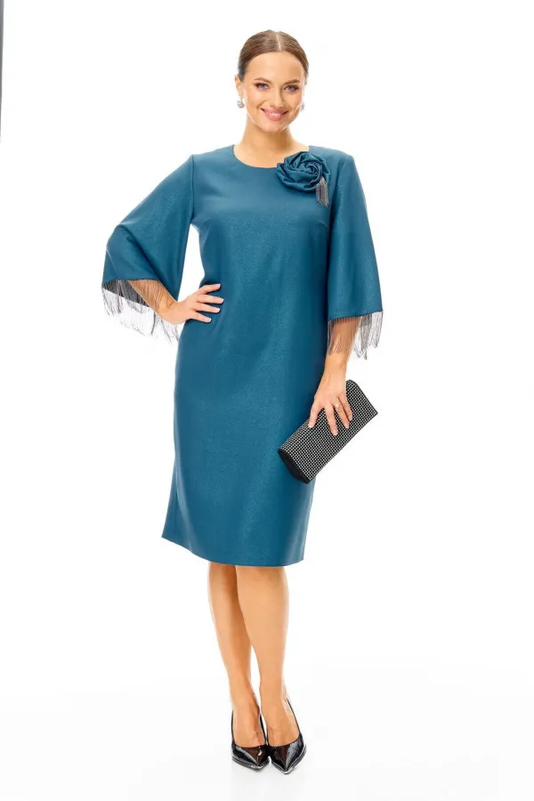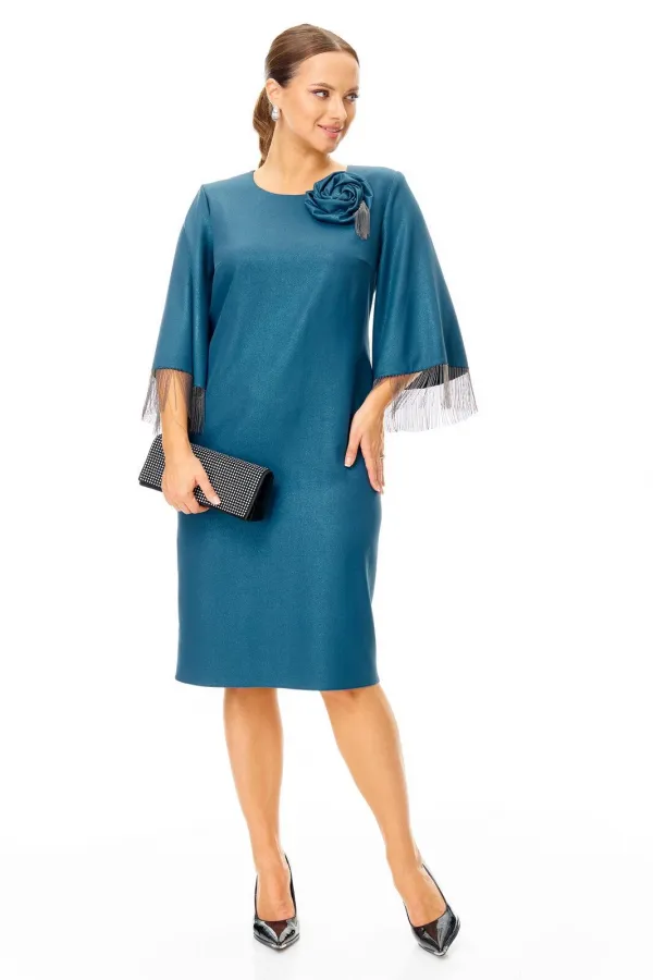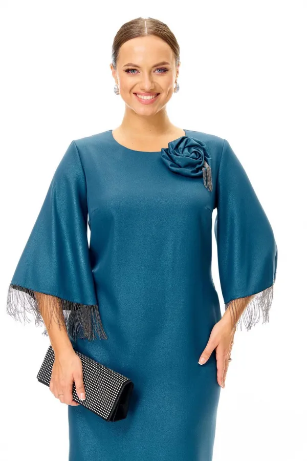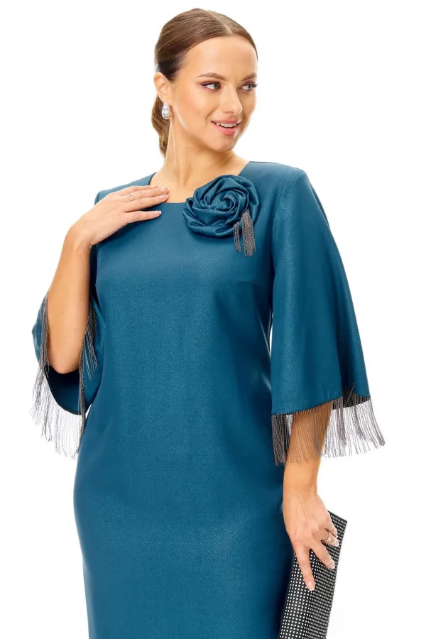 Нарядное женственное платье из ткани с блестящим напылением и декоративным съемным цветком. Платье полуприлегающего силуэта. Горловина круглая. Рукав расширенный длина 3/4 с необычной бахромой из цепочки по низу. По ... Читать далее...