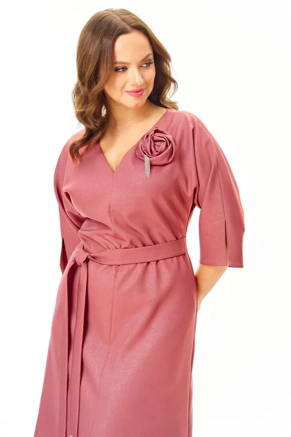 Нарядное элегантное платье из плотной ткани с легким блеском. Украшено съемным цветком. Полуприлегающего силуэта с небольшим расклешением к низу. Горловина V-образной формы. Застежка молния по спинке. Рукав цельнокроеный с разрезом. По переду невысокий соблазнительный разрез. Пояс съемный. Платье без подкладки.