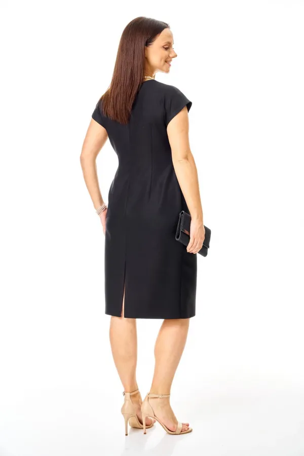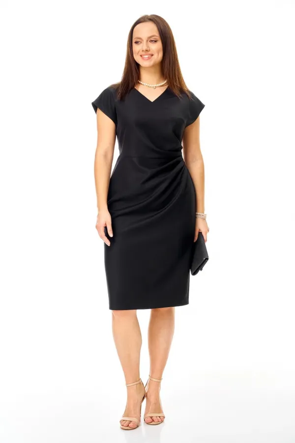 Элегантное нарядное женственное платье из ткани с деликатным блестящим напылением. Платье полуприлегающего силуэта мягко подчеркивает фигуру. V-образный неглубокий вырез визуально вытягивает линию шеи. Драпировка складками по линии талии красиво формирует силуэт. Плечо спущено. Без рукава. По спинке застежка «молния». Платье без подкладки.