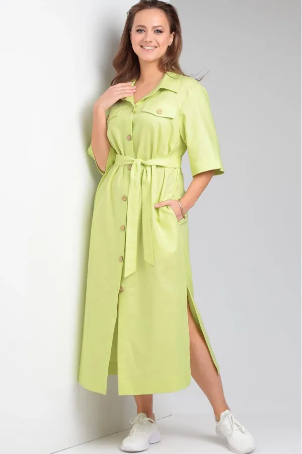 Женское платье свободного покроя из однотонного льна. По переду центральная застежка на петли-пуговицы. Нагрудные вытачки из бокового шва, кокетка выше уровня груди с отделочными клапанами. Спинка цельная, кокетка. В боковых швах функциональные карманы и разрезы. Воротник рубашечного типа на стойке. Рукав втачной со спущенной линией плеча. В комплекте сьемный пояс из основной ткани.