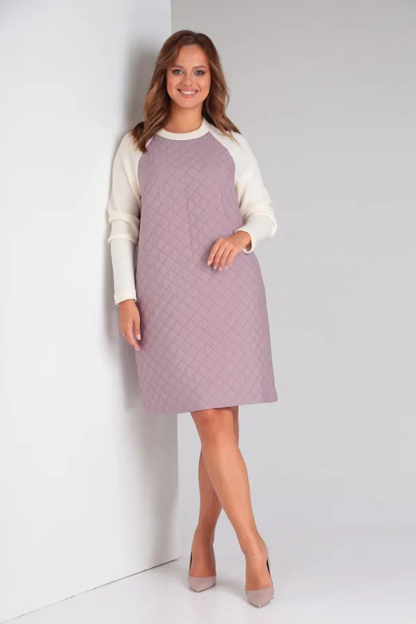 Платье женское А-силуэта свободного покроя из двух видов ткани: стежка и трикотажное полотно (отделочная ткань). Перед цельный с нагрудными вытачками. По спинке кокетка с центральной застедкой на петли и пуговицы. Рукав покроя реглан из отделочной ткани. Горловина округлой формы обработана планкой из отделочной ткани.