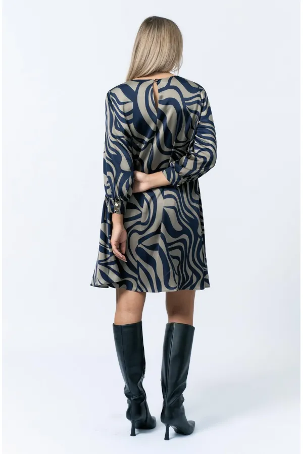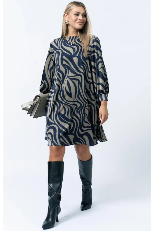 Платье женское А-образного силуэта. Горловина округлой формы. Рукав втачной.По низу рукава манжет застегивается на 2 петли пуговицы. Спинка со средним швом. По спинке вырез с застежкой на петлю пуговицу.