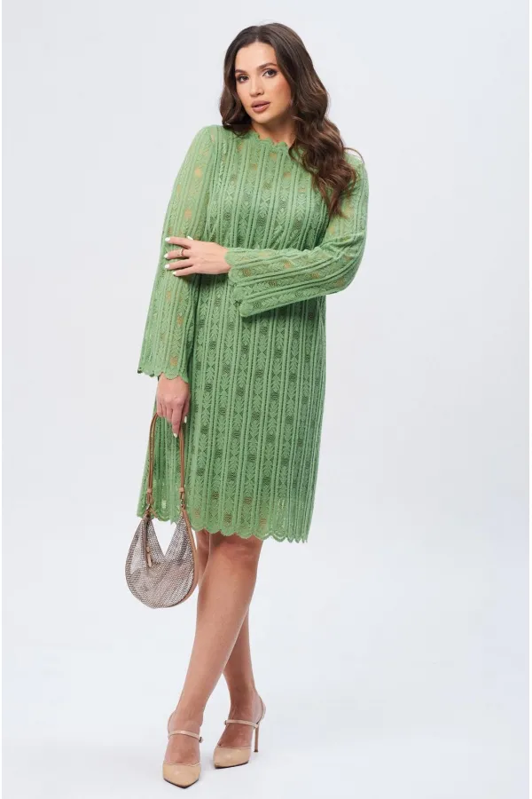 Элегантное женское платье А-образного силуэта, созданное для изысканных образов. Модель выполнена из высококачественной кружевной ткани зелёного цвета с изысканным геометрическим узором, который придает особый шарм. Платье дополнено ажурной горловиной со стойкой, что добавляет изделию тонкой элегантности. Застежка на спине на петлю и пуговицу обеспечивает удобство при надевании. Рукава платья втачные, слегка расширенные книзу, добавляют образу нотку романтической невесомости. Подкладка гарантирует комфортное ношение. Это платье — идеальный выбор для торжественных событий и важных встреч.
