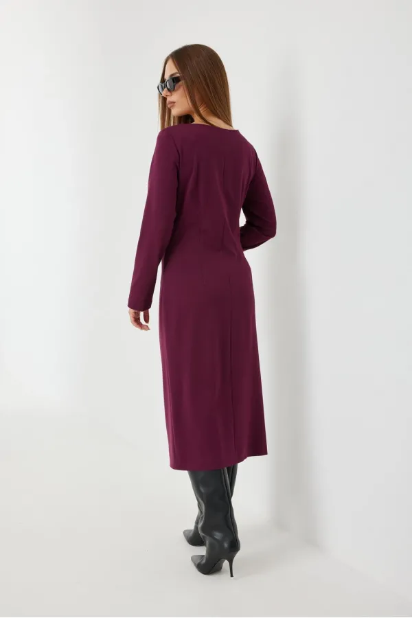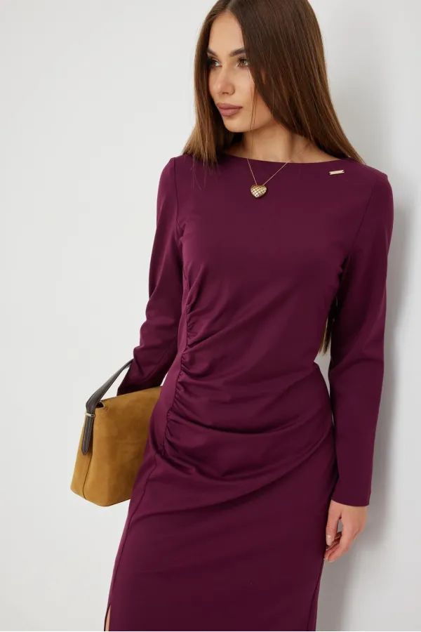 Платье женское из приятной трикотажной ткани на подкладке. Рукав длинный, одношовный. По спинке средний шов и талевые вытачки, что создает приталенный силуэт. Драпировка и сборка на животе корректирует фигуру подчеркивая женственность. Разрез по ноге добавляет игривости, делая образ более динамичным.
