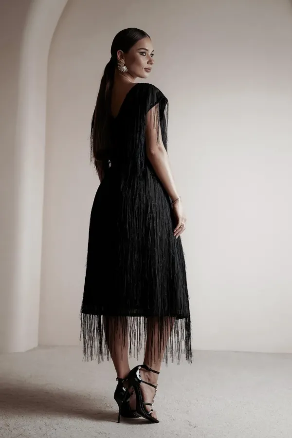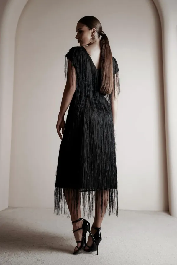 Платье свободного силуэта чуть расширенное к низу, с коротким цельновыкроенным рукавом, из нарядной плательно-блузочной ткани с бахромой. По переду горловина округлой формы, по спинке-V-образной. Платье на атласной подкладке.