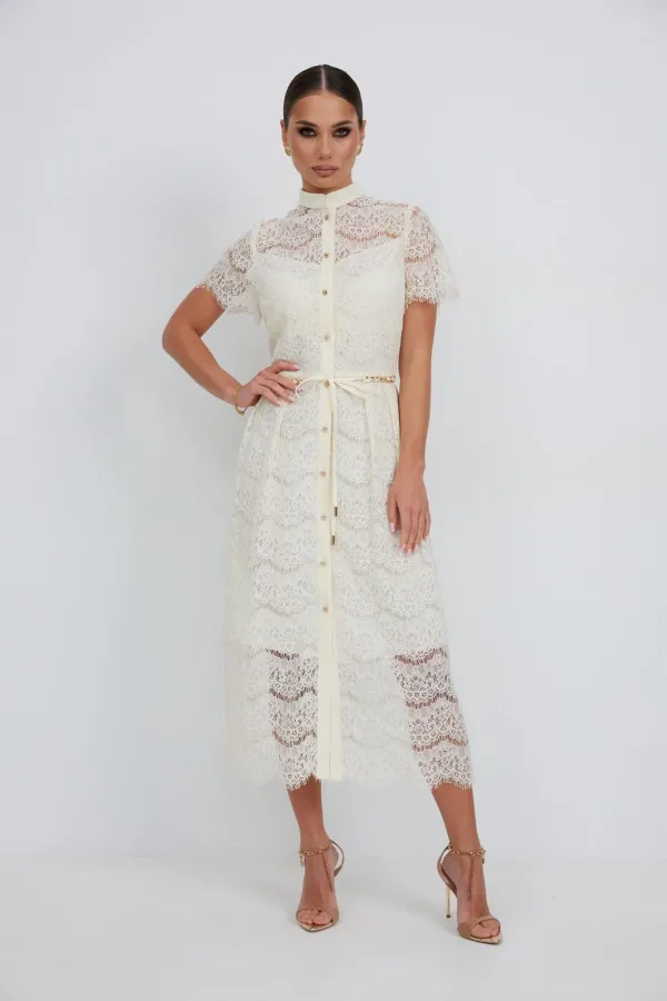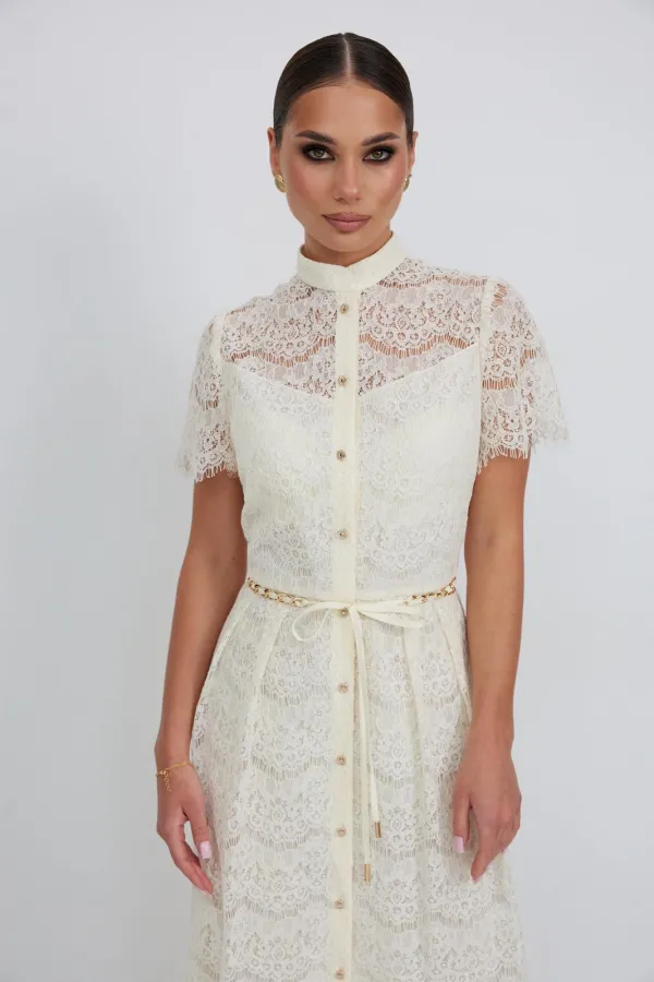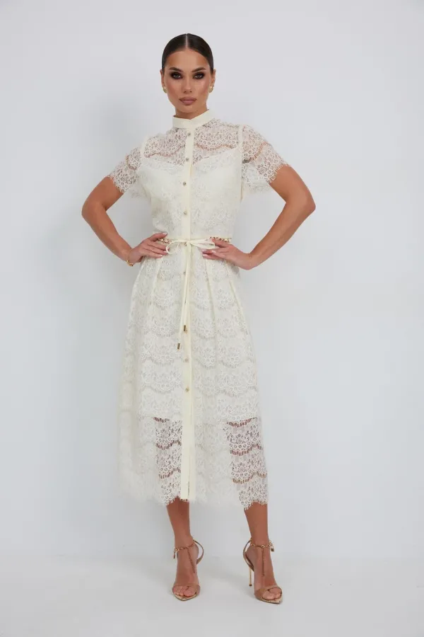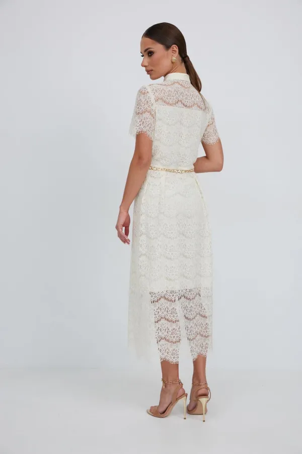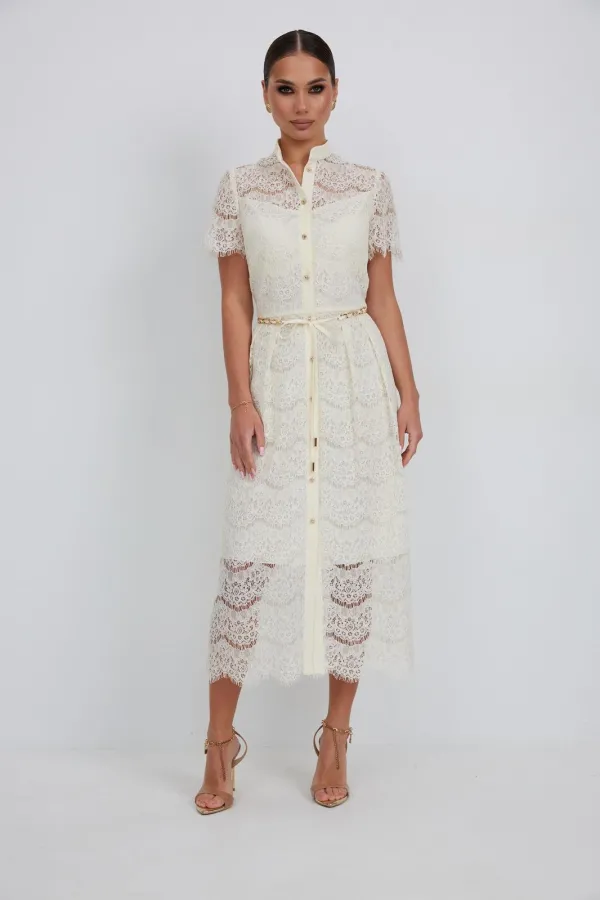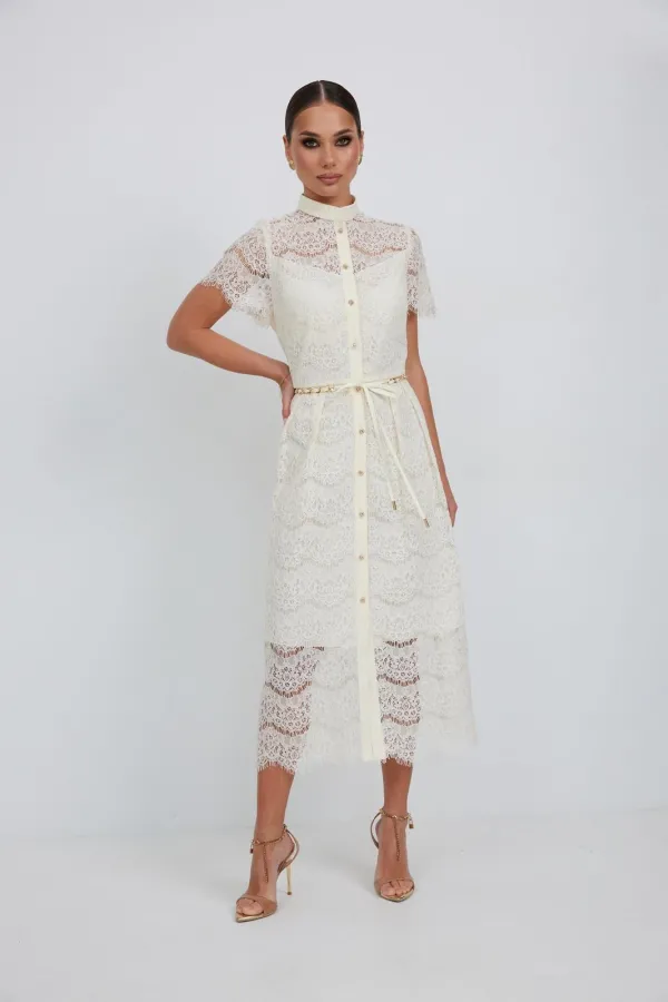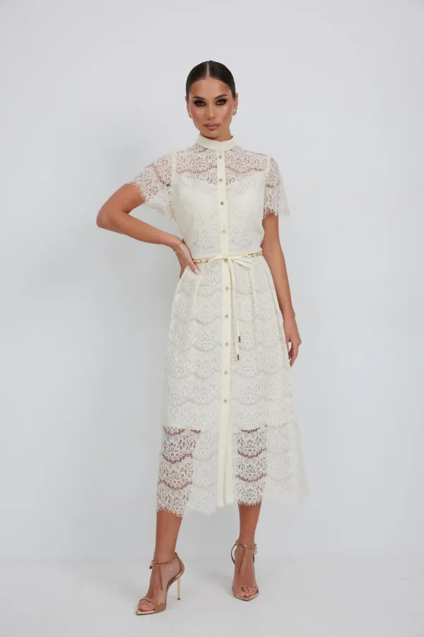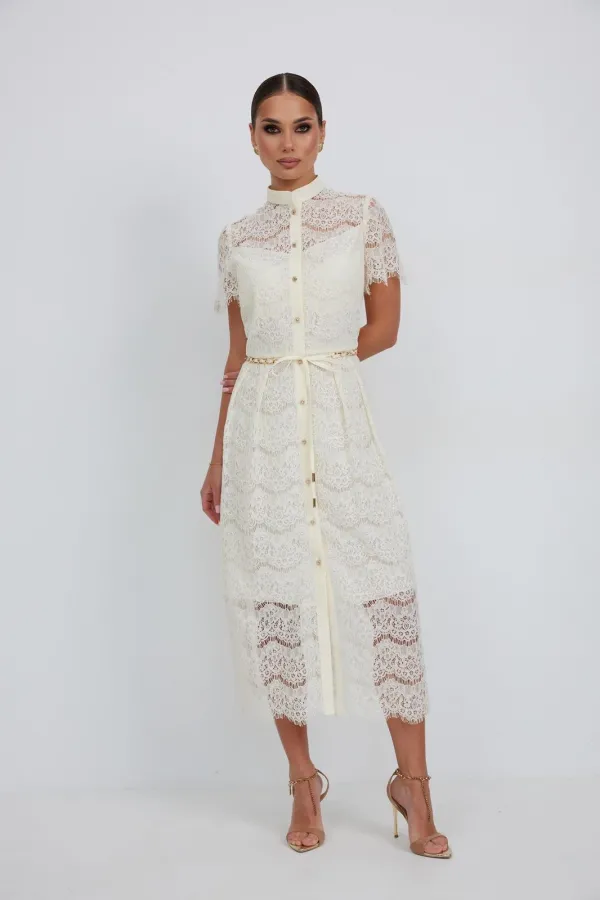 Платье из кружевной ткани полуприлегающего силуэта длины «миди» расширенное к низу. По талии подрез, нижняя часть платья со встречными складками по талии. По переду планка с застежкой на петли и пуговицы. По горловине стойка. Рукав втачной короткий. Платье на подкладке.