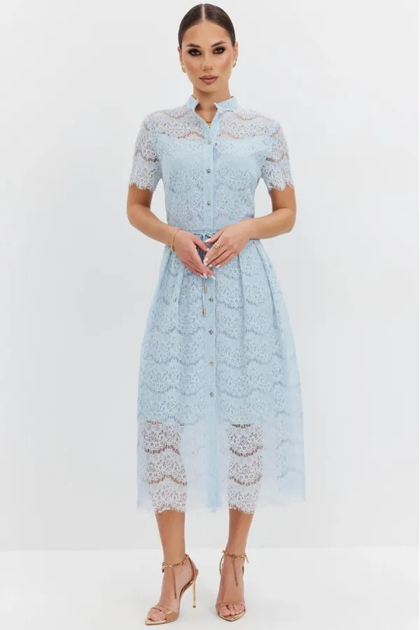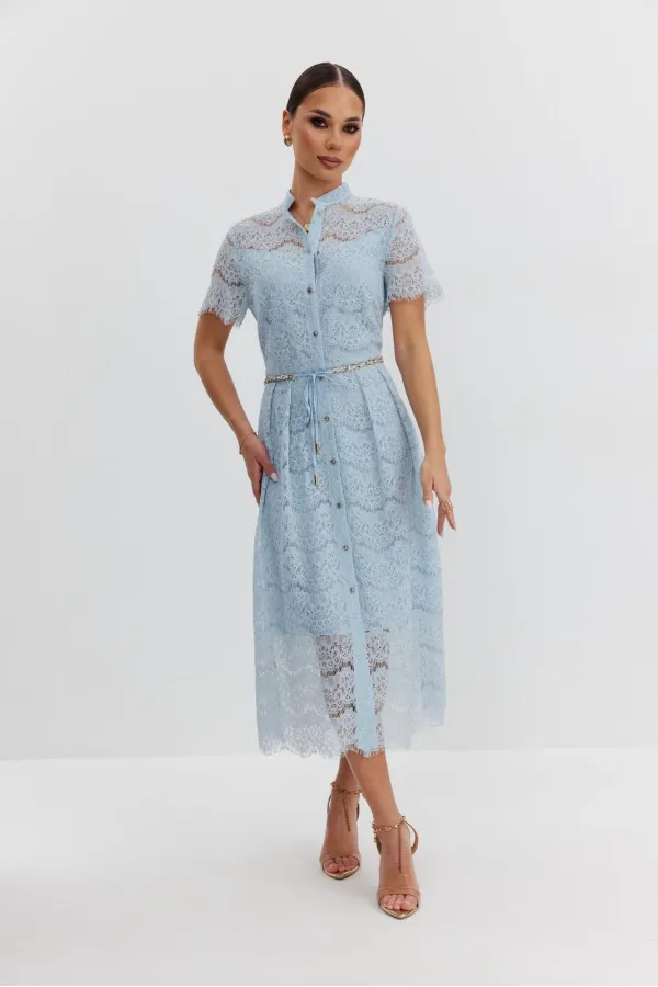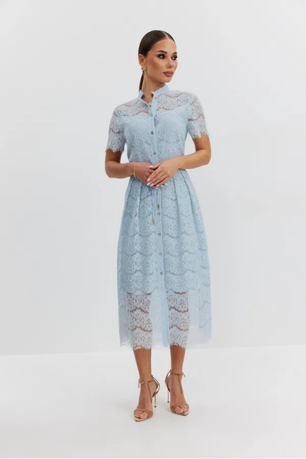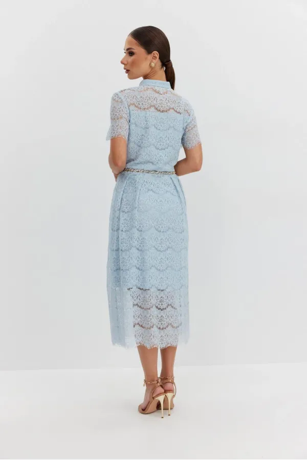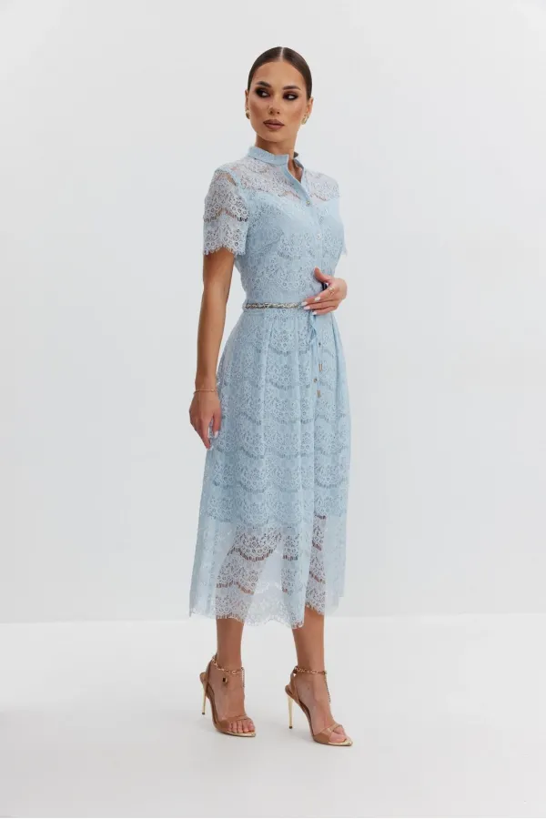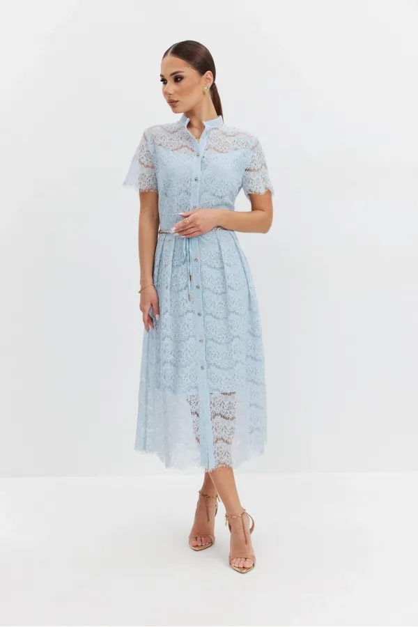 Платье из кружевной ткани полуприлегающего силуэта длины «миди» расширенное к низу. По талии подрез, нижняя часть платья со встречными складками по талии. По переду планка с застежкой на петли и пуговицы. По горловине стойка. Рукав втачной короткий. Платье на подкладке.