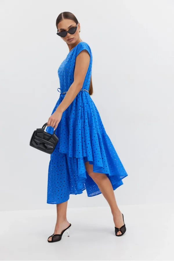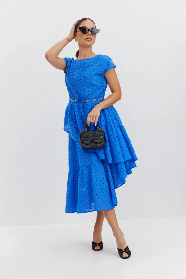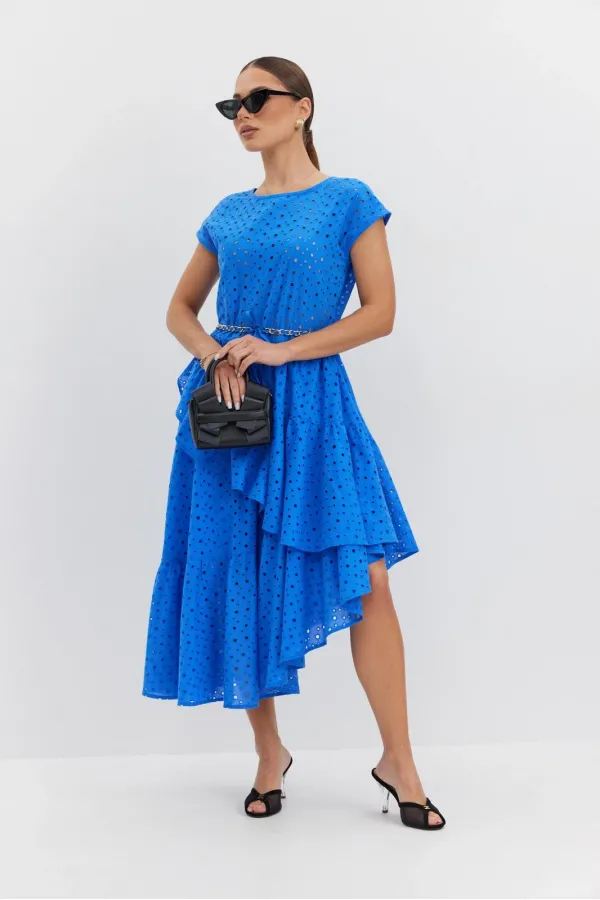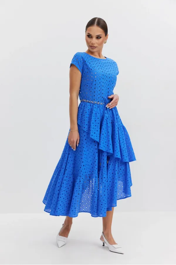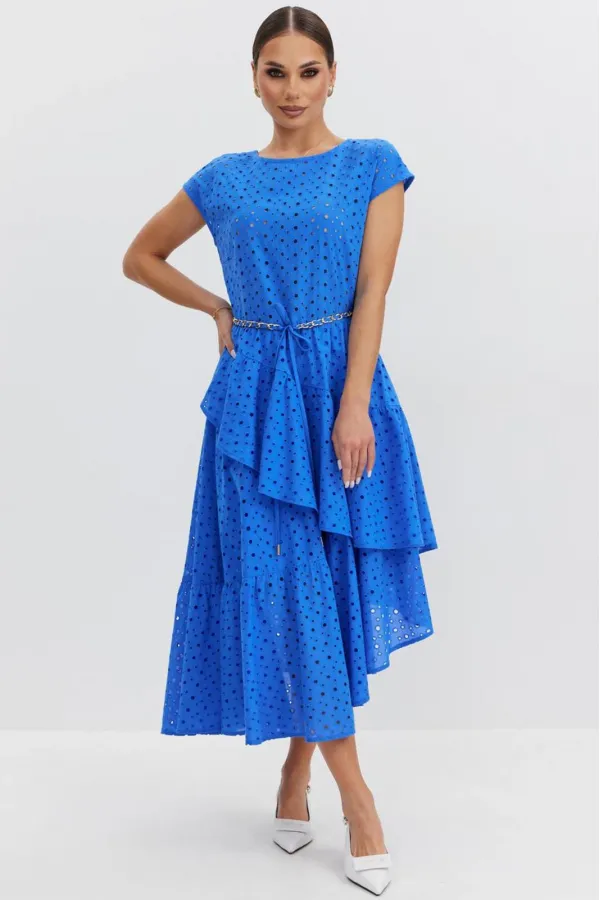 Платье женское полуприлегающего силуэта, отрезное по линии талии, юбка на подкладке. Лиф платья без подкладки, по переду вырез горловины округлой формы, по спинке – V-образной, линия плеча спущена. Юбка платья сложного асимметричного кроя с запахом, с воланами и небольшой сборкой по талии. Застежка на потайную молнию в боковом шве. По талии шлевки, в которые протянута декоративная цепочка-пояс.