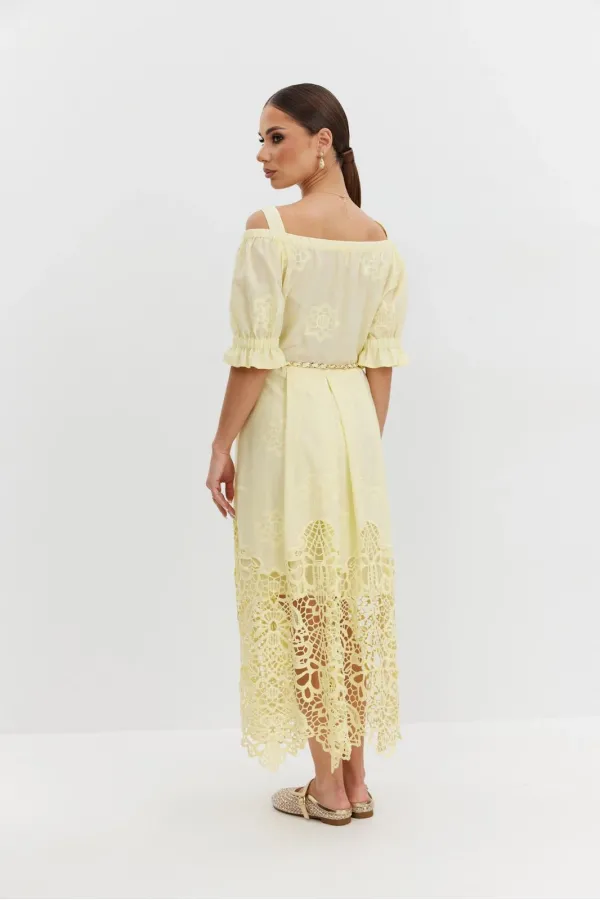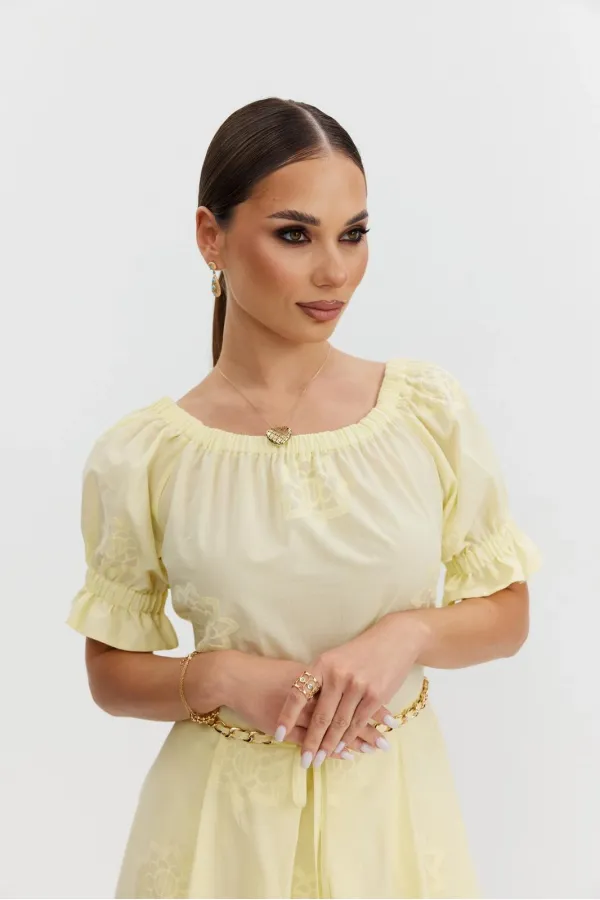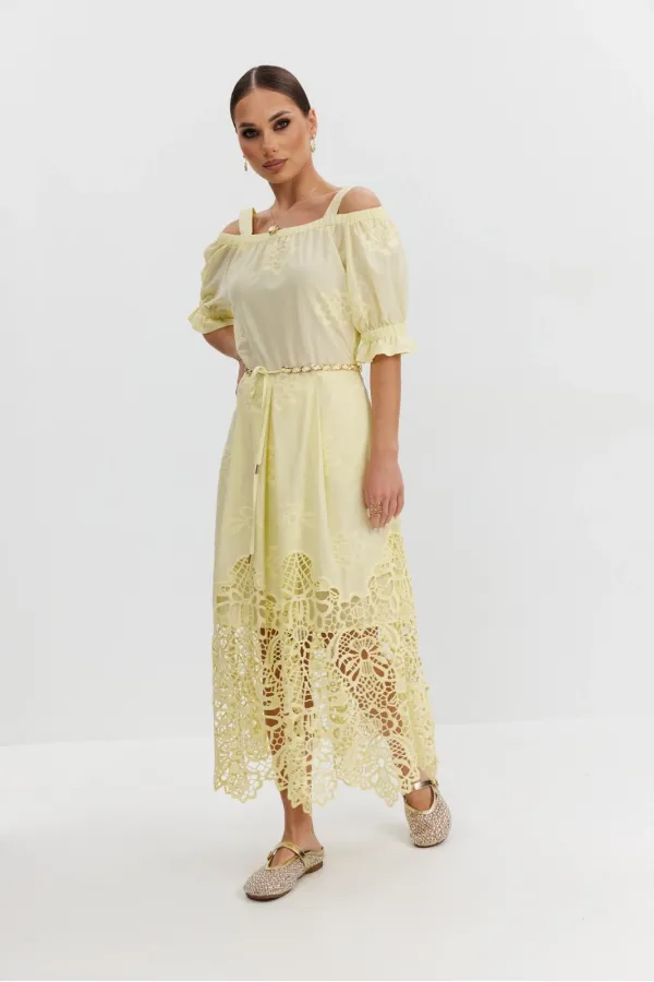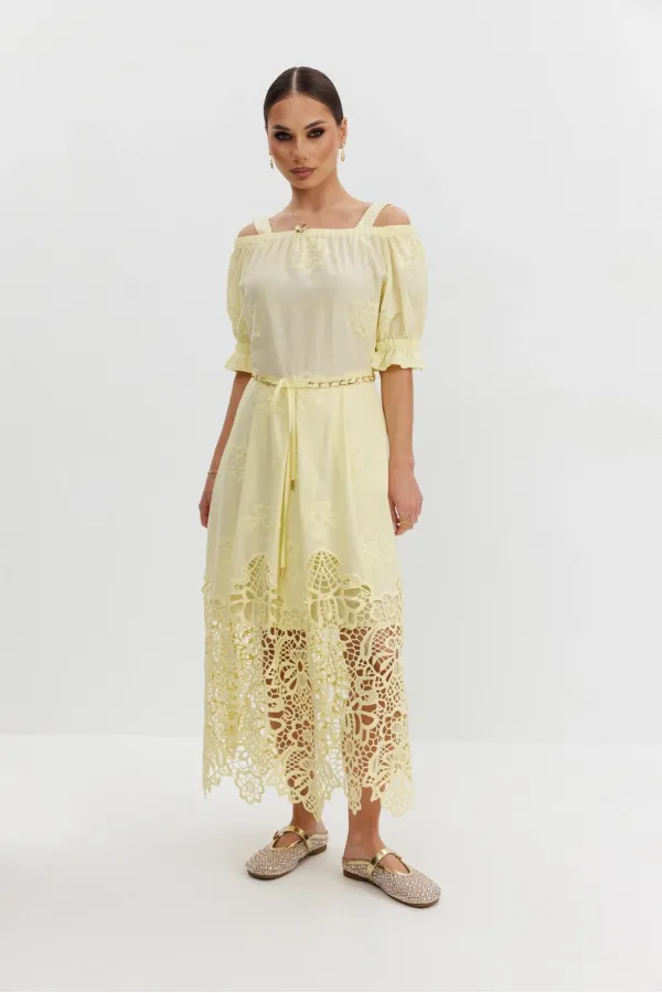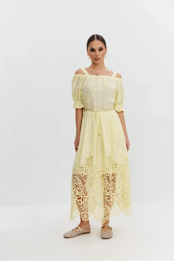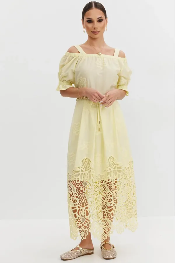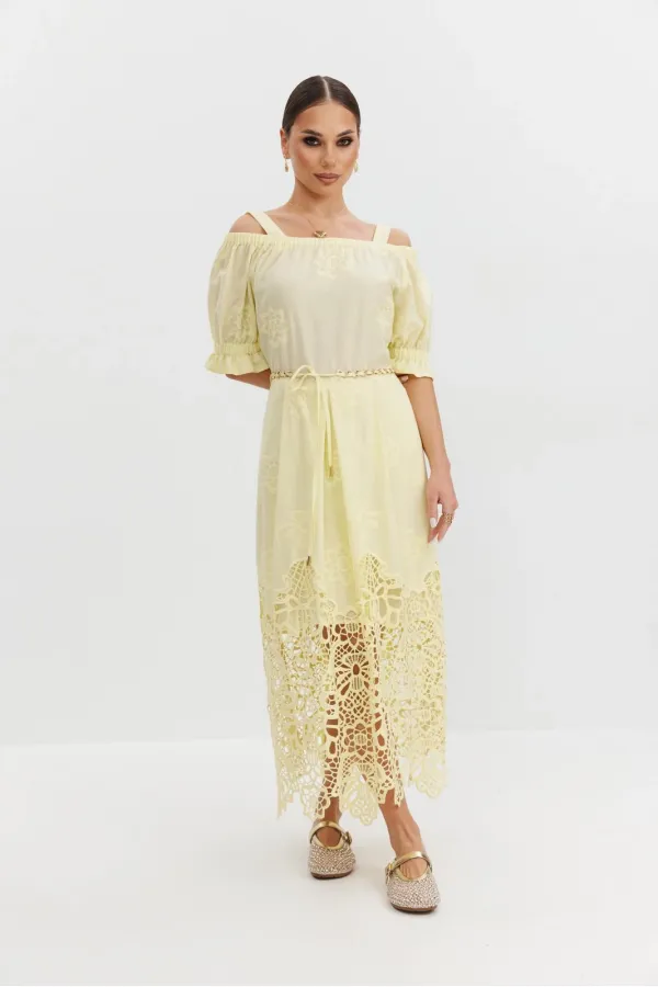 Платье из хлопковой ткани «ришелье». Длина макси. Платье отрезное по талии, юбка со складками. Верх с открытыми плечами и съемными бретелями. Застежка в боковом шве на потайную молнию. Рукав «фонарик». В боковых швах карманы. В комплекте декоративный пояс-завязка. Платье на подкладке.