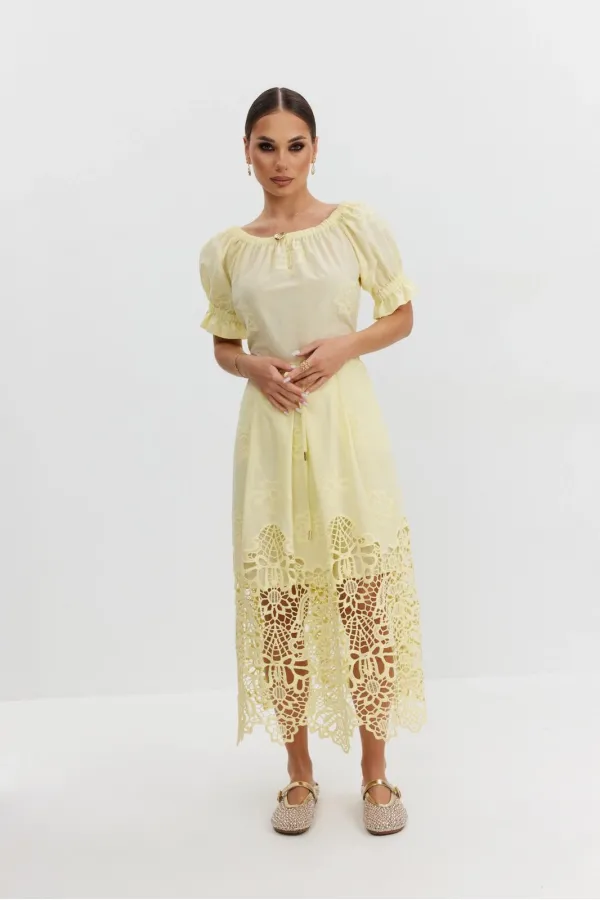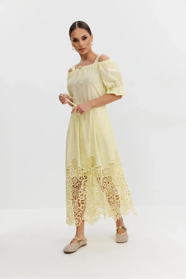 Платье из хлопковой ткани «ришелье». Длина макси. Платье отрезное по талии, юбка со складками. Верх с открытыми плечами и съемными бретелями. Застежка в боковом шве на потайную молнию. Рукав «фонарик». В боковых швах кар... Читать далее...