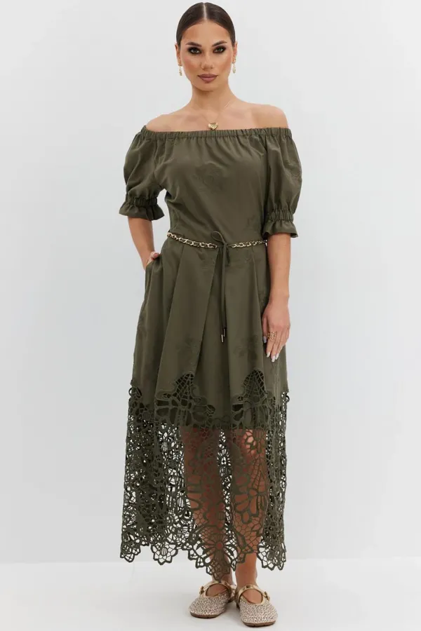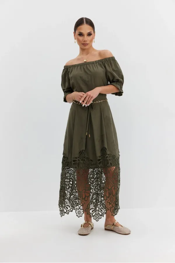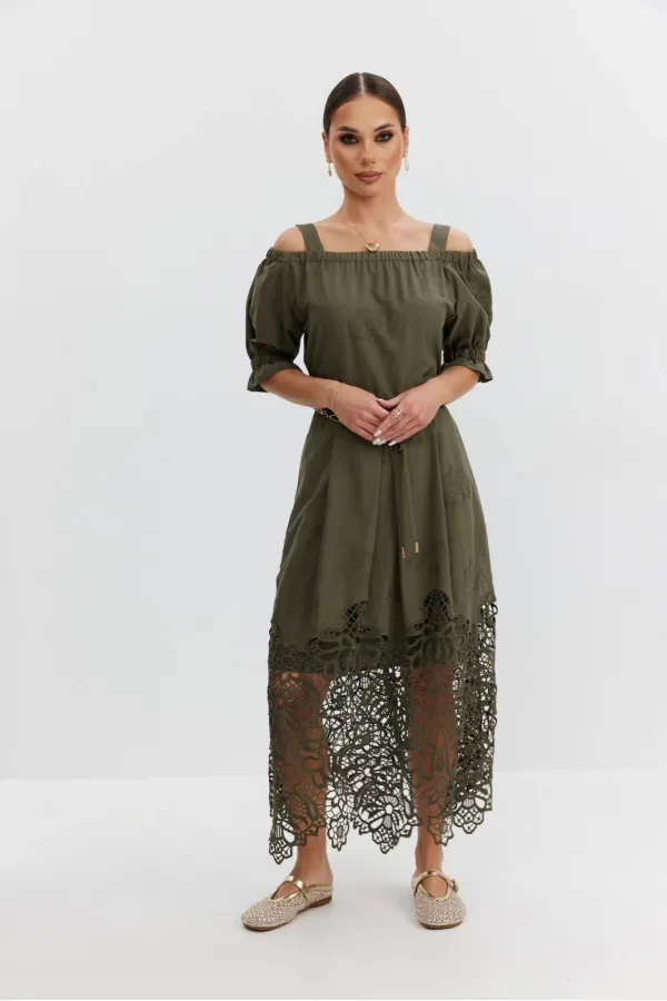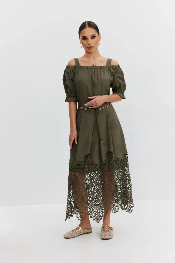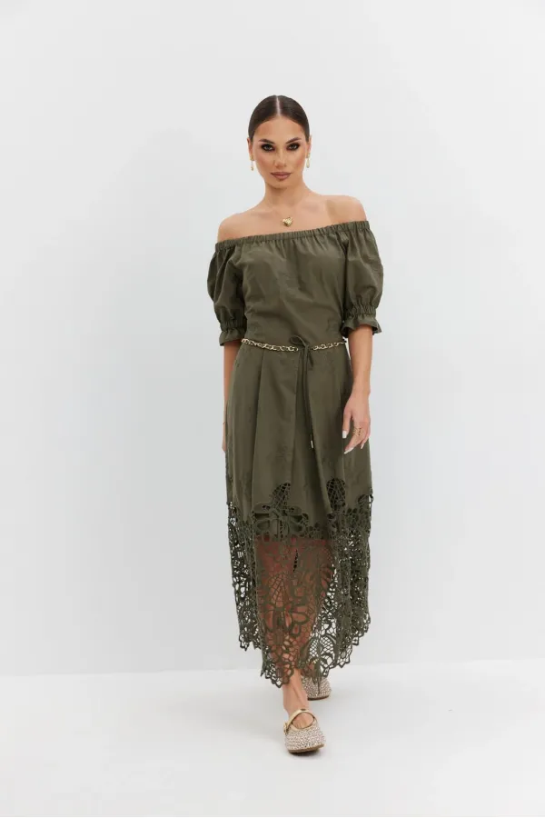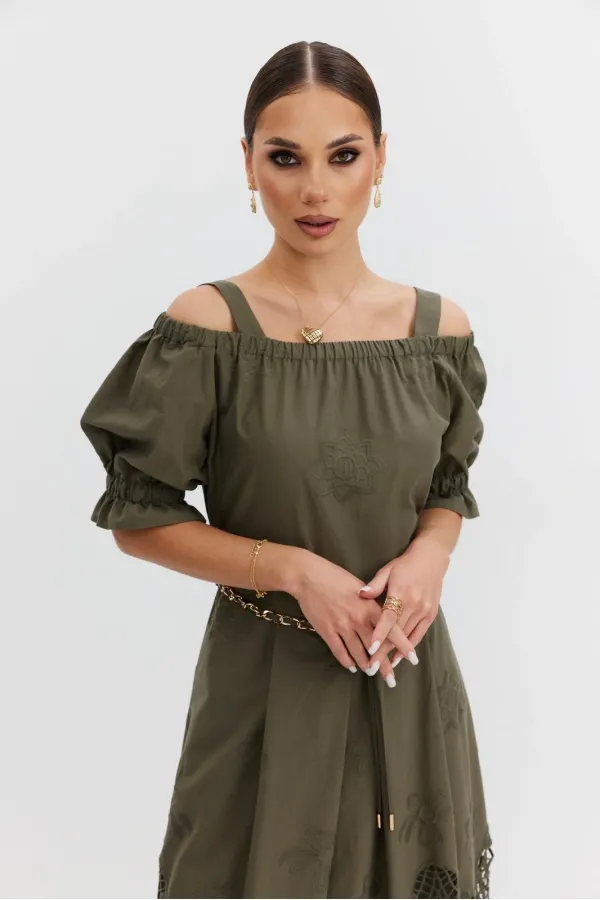Платье из хлопковой ткани «ришелье». Длина макси. Платье отрезное по талии, юбка со складками. Верх с открытыми плечами и съемными бретелями. Застежка в боковом шве на потайную молнию. Рукав «фонарик». В боковых швах карманы. В комплекте декоративный пояс-завязка. Платье на подкладке.