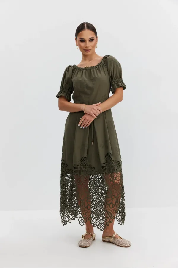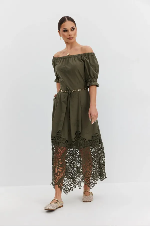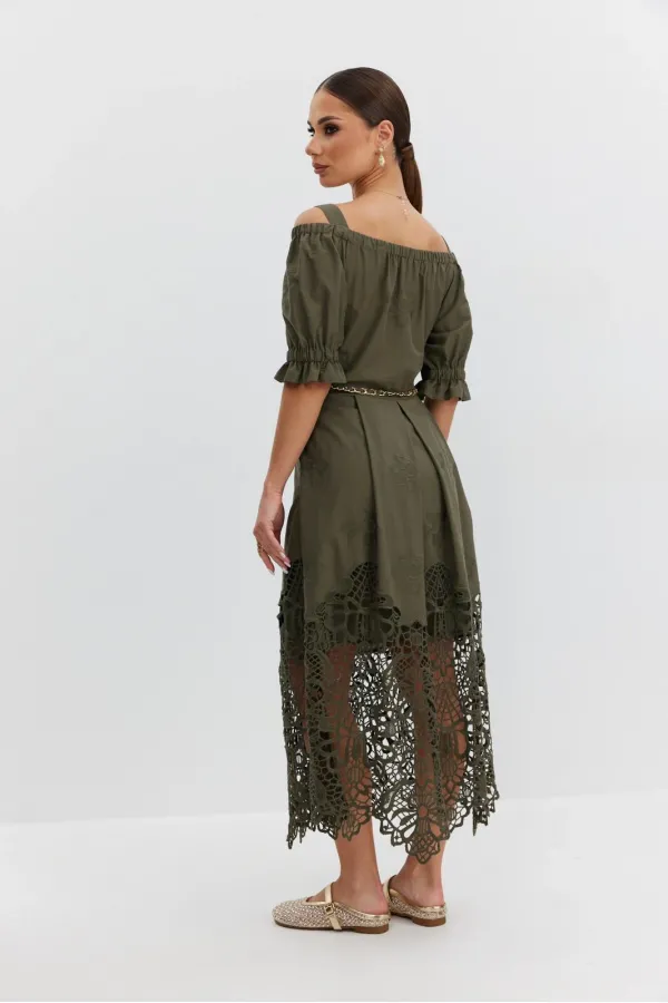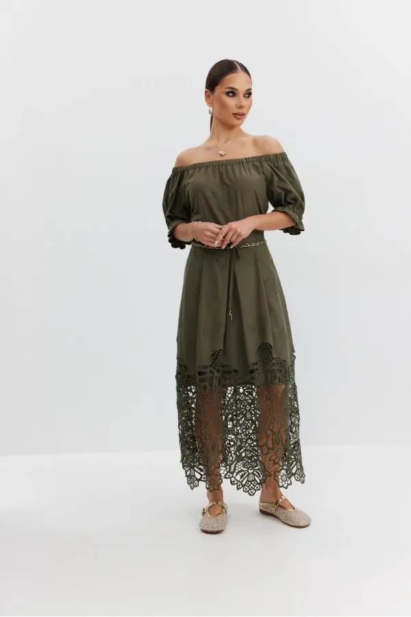 Платье из хлопковой ткани «ришелье». Длина макси. Платье отрезное по талии, юбка со складками. Верх с открытыми плечами и съемными бретелями. Застежка в боковом шве на потайную молнию. Рукав «фонарик». В боковых швах кар... Читать далее...