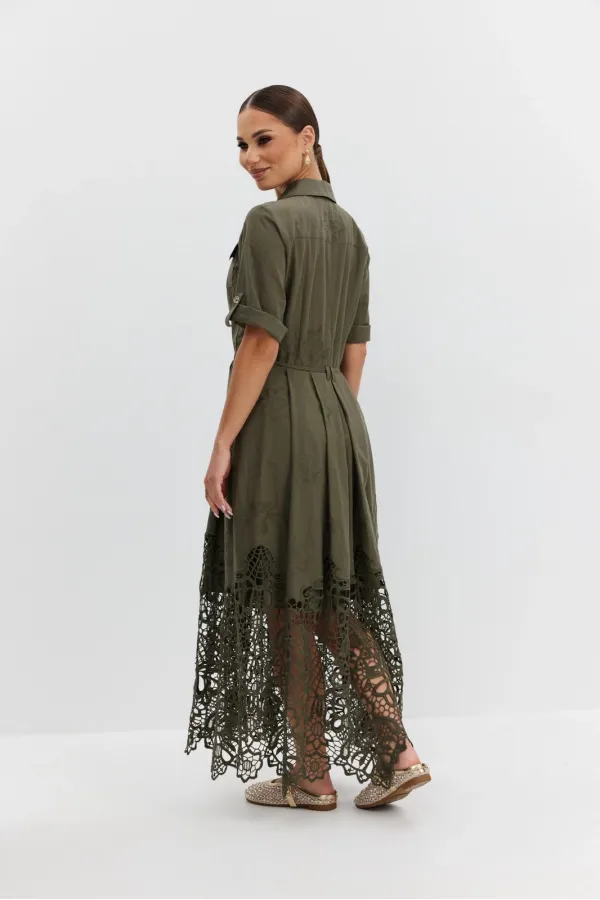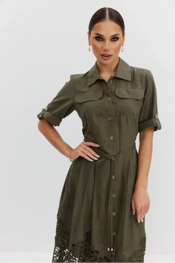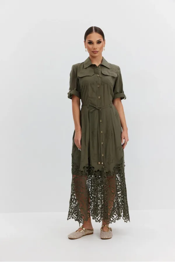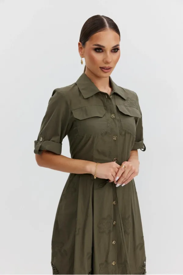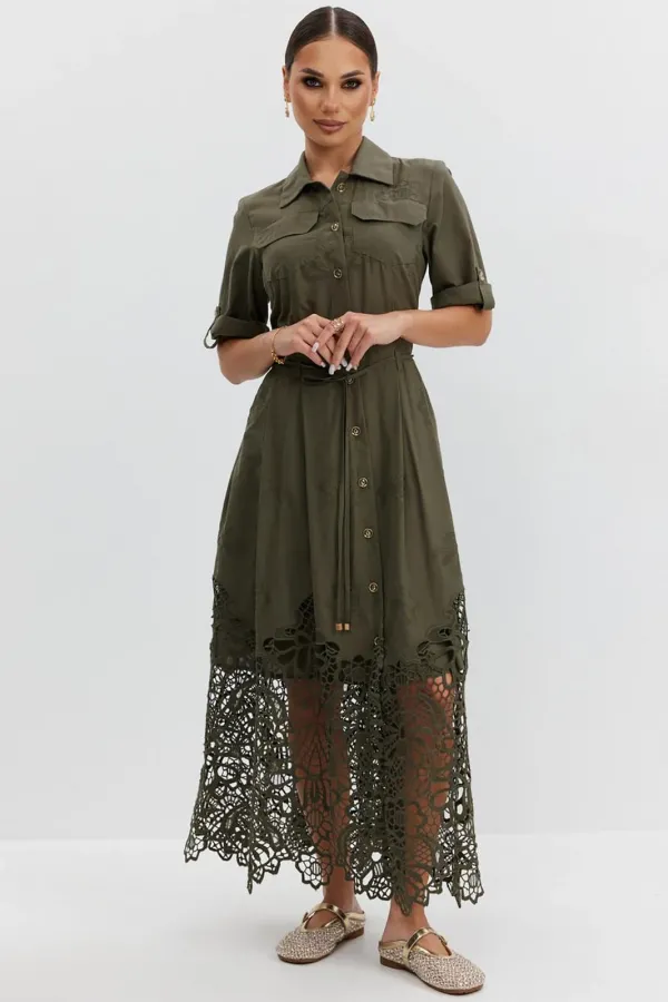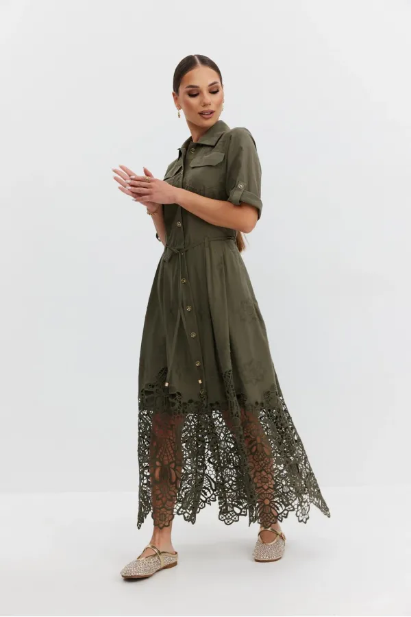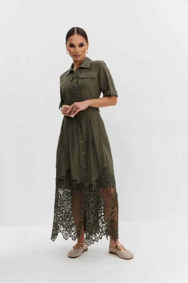 Платье из ажурной хлопковой ткани. Длина макси. Застежка на петли и пуговицы. Платье отрезное по талии. Воротник рубашечный. По переду накладные карманы с клапаном. Рукав прямой ¾ с регулируемой патой. По юбке платья складки. В боковых швах карманы. В комплекте съемный пояс-завязка. Юбка платья на хлопковой подкладке.