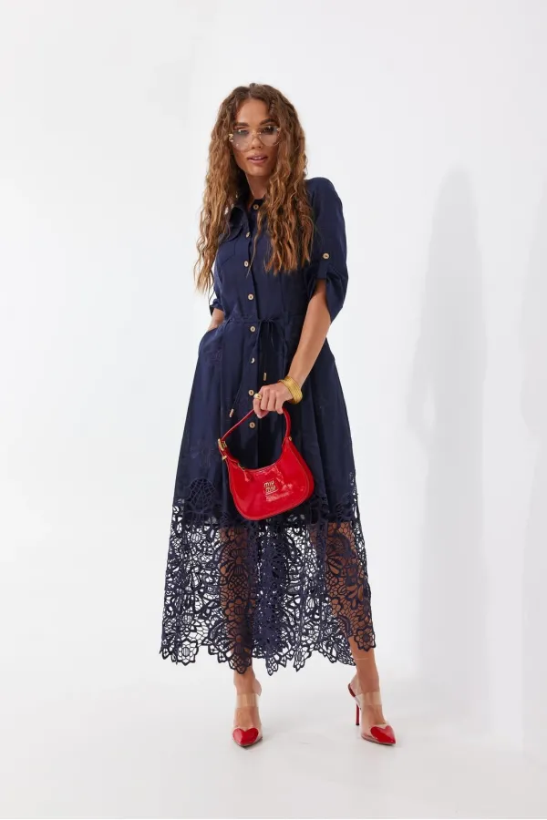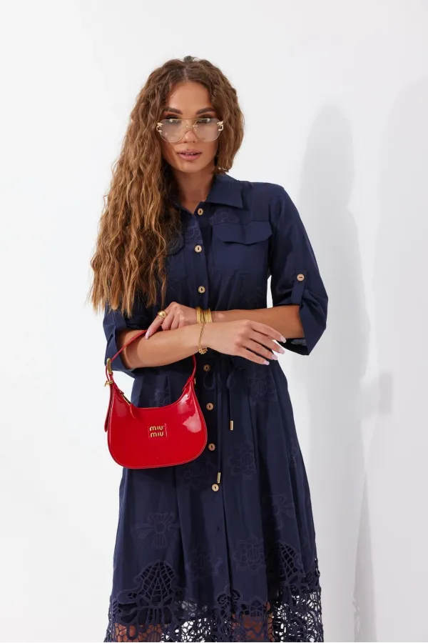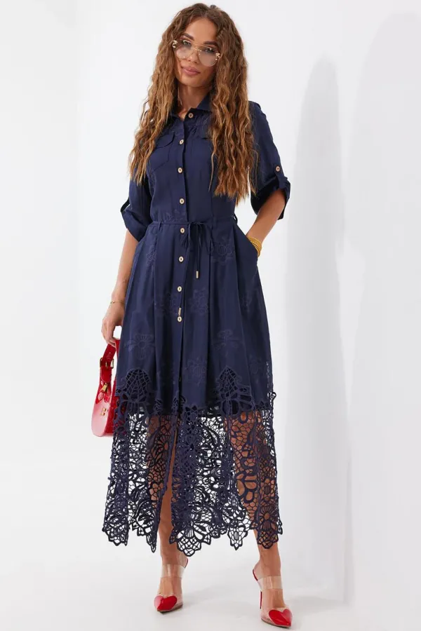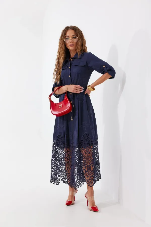 Платье из ажурной хлопковой ткани. Длина макси. Застежка на петли и пуговицы. Платье отрезное по талии. Воротник рубашечный. По переду накладные карманы с клапаном. Рукав прямой ¾ с регулируемой патой. По юбке платья складки. В боковых швах карманы. В комплекте съемный пояс-завязка. Юбка платья на хлопковой подкладке.