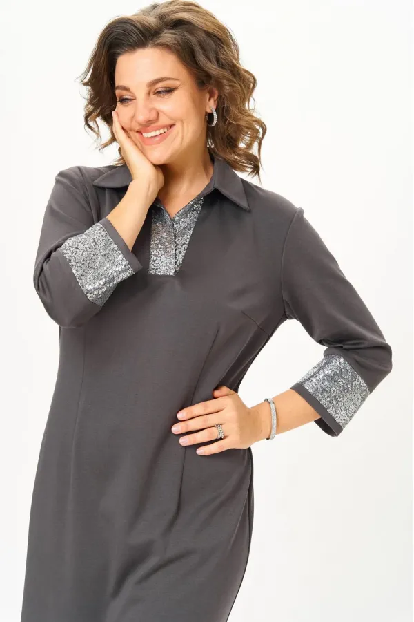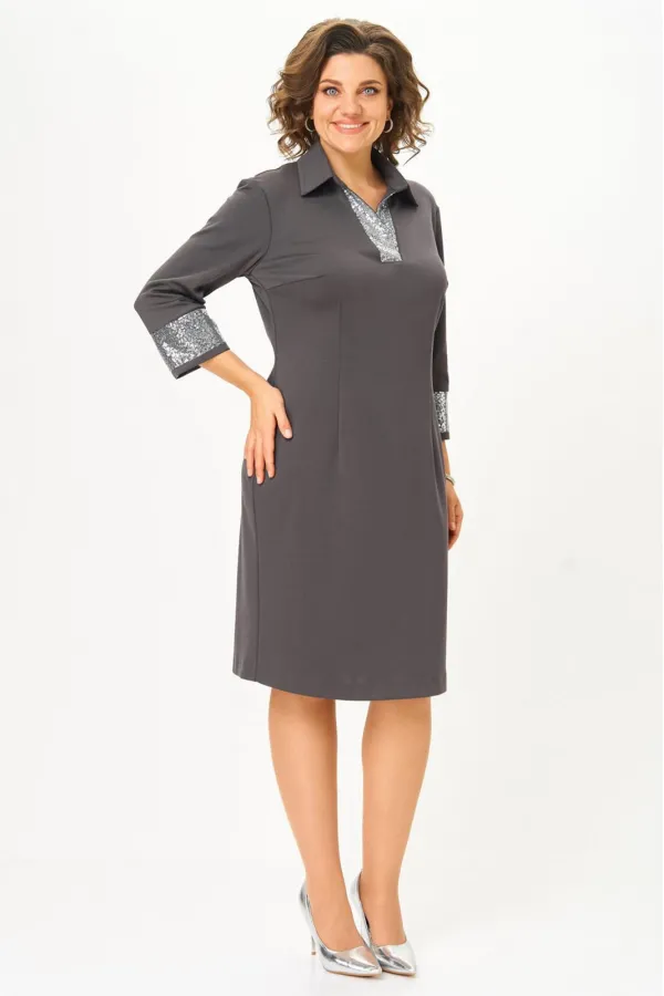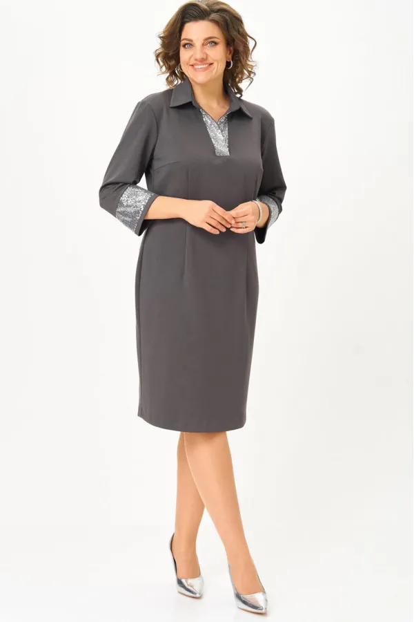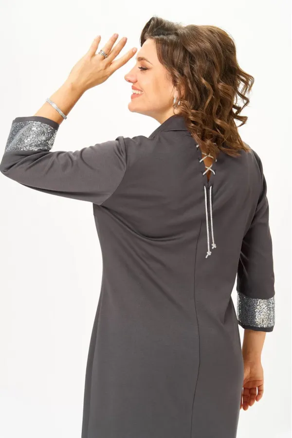 Стильное женское платье прямого силуэта — идеальный выбор для тех, кто ценит комфорт, элегантность и современный дизайн. Модель выполнена из мягкого, приятного к телу трикотажа, который отлично сидит по фигуре, не стесняет движения и подчёркивает достоинства силуэта, дополнено отделочной тканью «паетки».Горловина платья обработана рубашечным воротником и планками из отделочной ткани, по полочке талевые выточки. Спинка с средним швом, в раене горловины сделан элемент капелька с петлями и отделочным шнуром из страз, рукав втачной по низу рукава манжет из отделочной ткани.