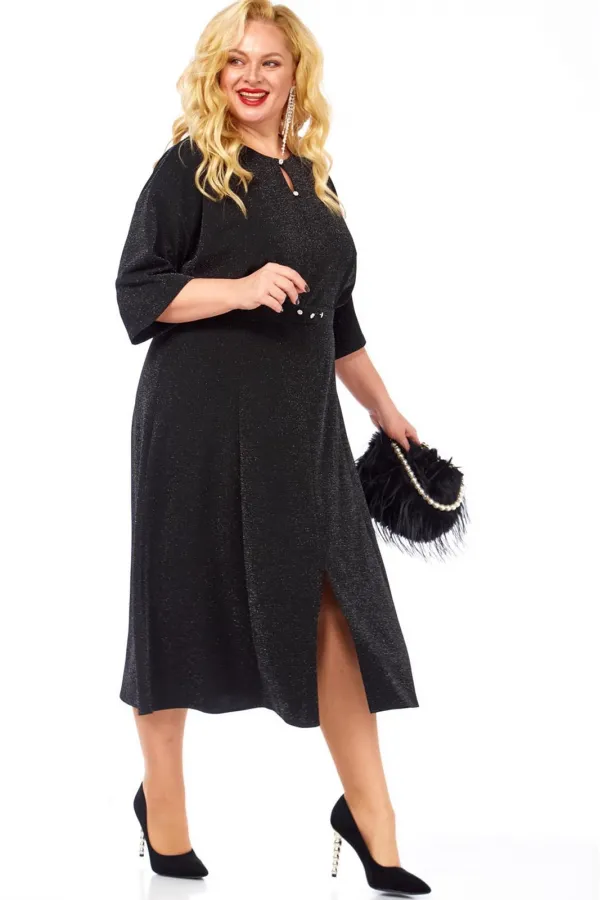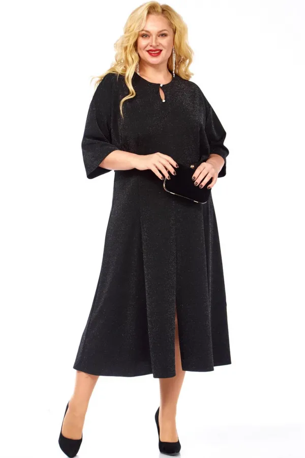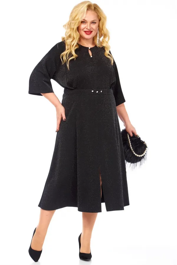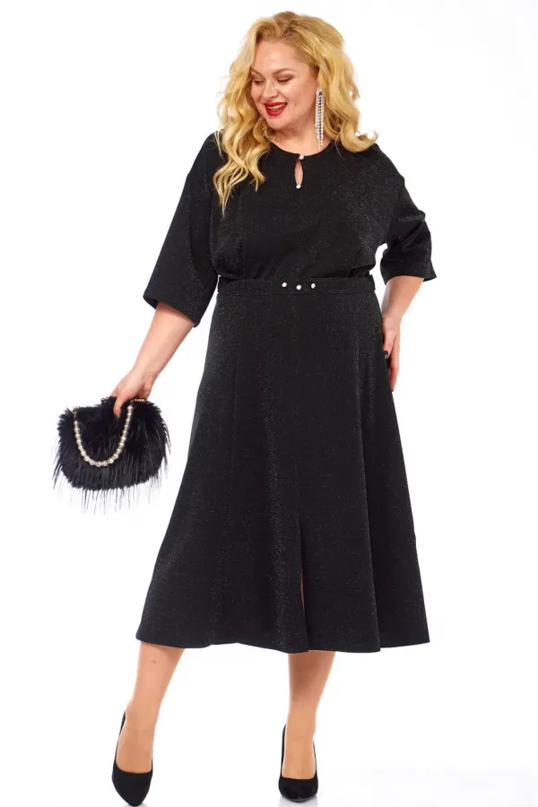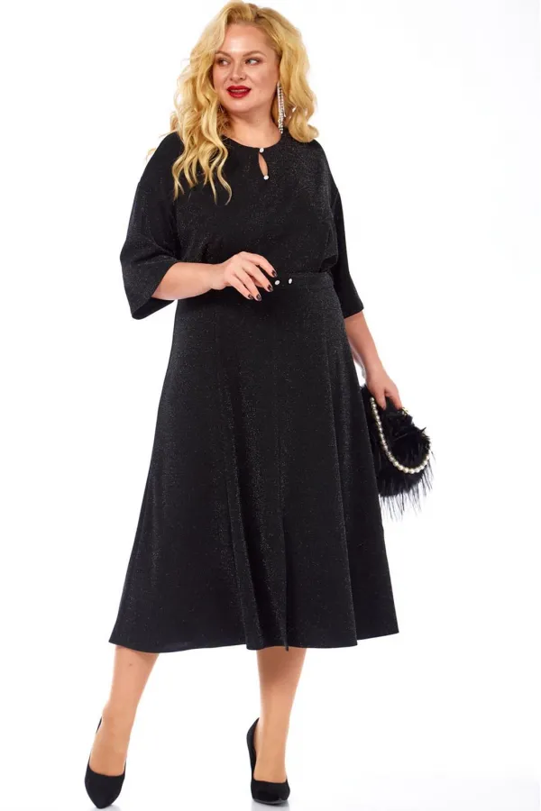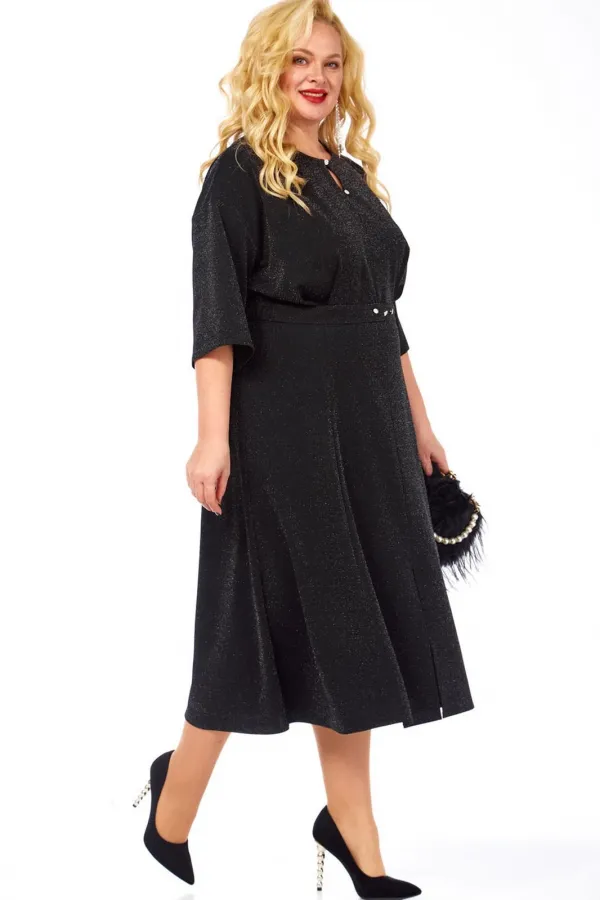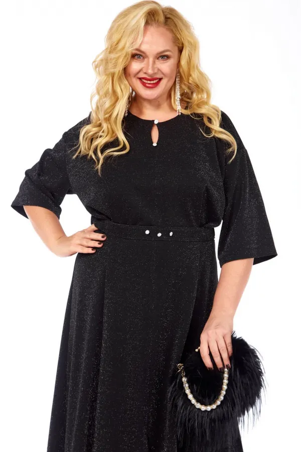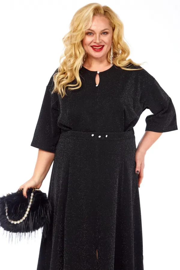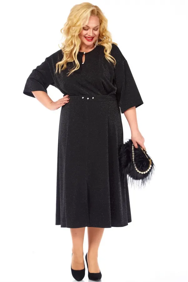 Эффектное женское платье расширенного силуэта к низу из ткани с нежной блестящей нитью. По переду платья в области талии заложены складки, круглая горловина с переходом в капельку обработана обтачкой , по капельке пришиты отделочные пуговицы, верхняя пуговица расстегивается. По задней половинке платья средний шов в шов вставлена молния. Низ платья слегка расширенный к низу. Рукав спущенный. Пояс съёмный застегивается на пуговицу сзади ,спереди пояса пришиты отделочные пуговицы.