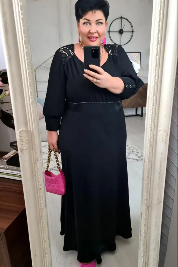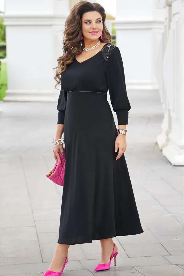 Шикарное женское платье классического черного цвета, а вставки из модного кружева делают Ваш образ нарядным и изысканным. В данном платье Вы будете неотразимы как на праздничной вечеринке, так и в вечернем выходе. Легкое платье с V- образным вырезом и кокетками из кружева на груди создает красивую зону декольте. Слегка завышенная линия талии с втачным поясом и декоративной тесьмой, и сборкой под грудью переходит в пышную струящуюся юбку. Спинка платья с V-образной вставкой из кружева и встречными деталями с заложенными складками, направленными к центру спинки. Рукав втачной снизу собран на высокую манжету с пуговицами. Платье на подкладке с застёжкой на молнию в боковом шве, благодаря универсальной длине миди ниже колена платье подойдет на женщин разного роста. Длина платья от высшей точки плечевого шва до низа 131 см (р.50-54), 134 см (р.56-60). Длина рукава 49 см.Подробные замеры смотрите на дополнительном фото. Подходит на рост 164-170.