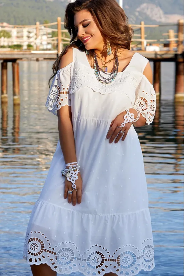 Прекрасное, легкое платье для летней прогулки. На ткани вышиты нежные горошки. Платье на широких бретелях, имеет фигурный (прямоугольный) вырез горловины. По переду расположены нагрудные вытачки, лиф платья украшен воланом с вышивкой. Ажурный втачной рукав с отрезным окатом собран на резинку. Платье А- образного силуэта, отрезное по линии талии с воланом по низу на сборке, украшенным фестонами. Длина платья по спинке 115 см (р.50-54), 117 см (р.56-60), длина рукава 20 см (р.50-54), 21 см (р.56-60).Подробные замеры смотрите на дополнительном фото. Подходит на рост 164-170.