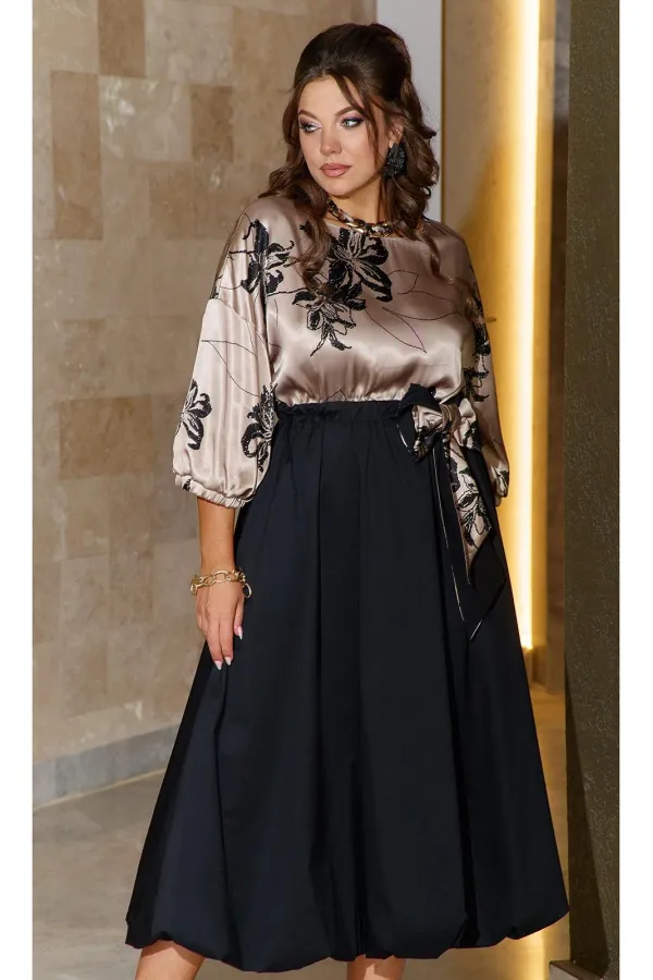 Невероятно красивое и элегантное платье отвечает всем требованиям вечернего наряда! Сочетание тканей разных фактур и дизайнов в одной модели - тренд сезона. Для лифа с мягкими присборенными рукавами мы выбрали пластичный атлас, а формоустойчивую тафту - для создания модной юбки «баллон». Сдержанный блеск атласа с деликатным принтом подчеркивает глубину тона черной тафты. Платье отрезное по талии, с круглой горловиной. Рукав длиной 7/8 со спущенной проймой и сборкой по низу на резинку. Длинная юбка «баллон» собирается по талии на эластичную ленту в отрезном поясе. По поясу платье декорировано бантом в виде съемной броши. Длина платья от высшей точки плечевого шва до низа – 129 см (р.48-52)- 130 см (р.54-58). Длина рукава – 31 см.Подробные замеры смотрите на дополнительном фото. Подходит на рост 164-170.