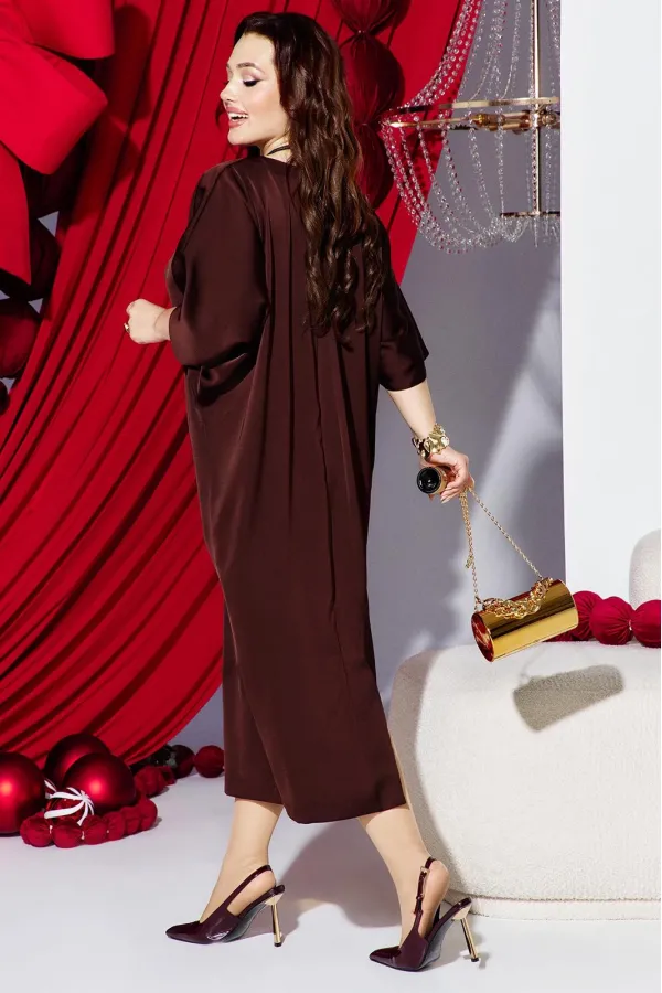 Это платье — олицетворение силы и изящности: ярко, но не кричаще. Уверенный, волнующий наряд для торжественных мероприятий и важных встреч. Силуэт «летучая мышь» мягко обтекает фигуру, создавая плавный переход между линией плеч и линией талии, затем свободно распускается по бокам, позволяя ткани играть волной при каждом движении. Вырез горловины V-образной формы подчёркивает изящную шею, а рукава добавляют образу лёгкую драматичность и женственность. По переду платья средний шов, с застроченной складкой выше уровня талии переходящую в складку по плечу. Спинка в платье со средним швом с разрезом от низа. Рукав в платье цельнокроеный со щеловидным вырезом проймы. Длина платья 123 см, длина рукава 48 см (р 52-56), 48,5 см (р 58-62).Подробные замеры смотрите на дополнительном фото. Подходит на рост 164-170.